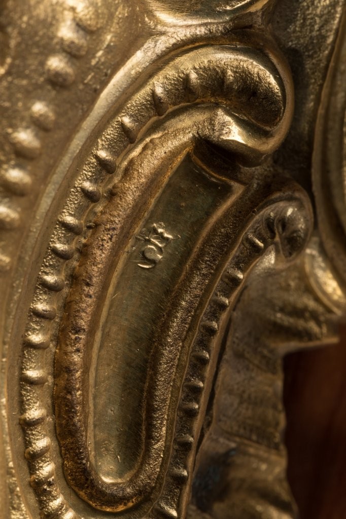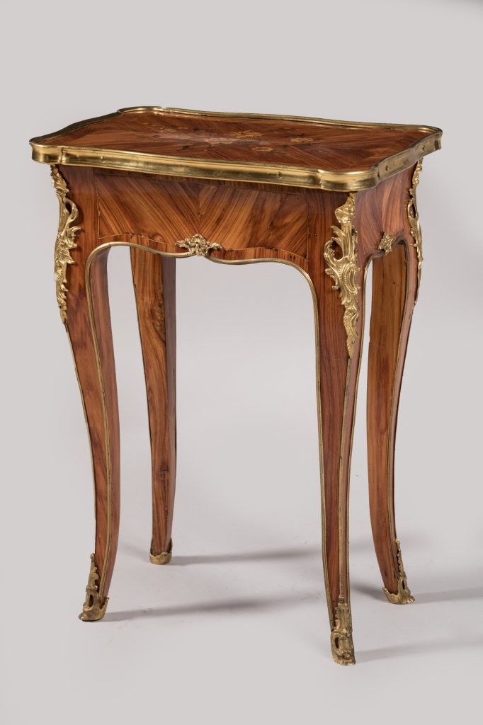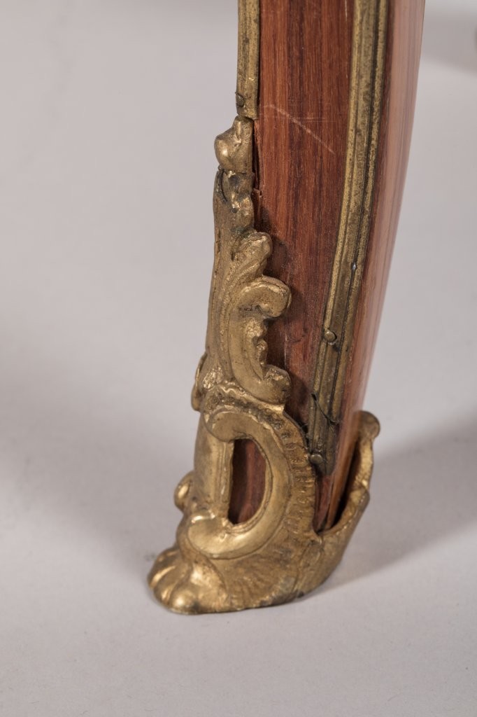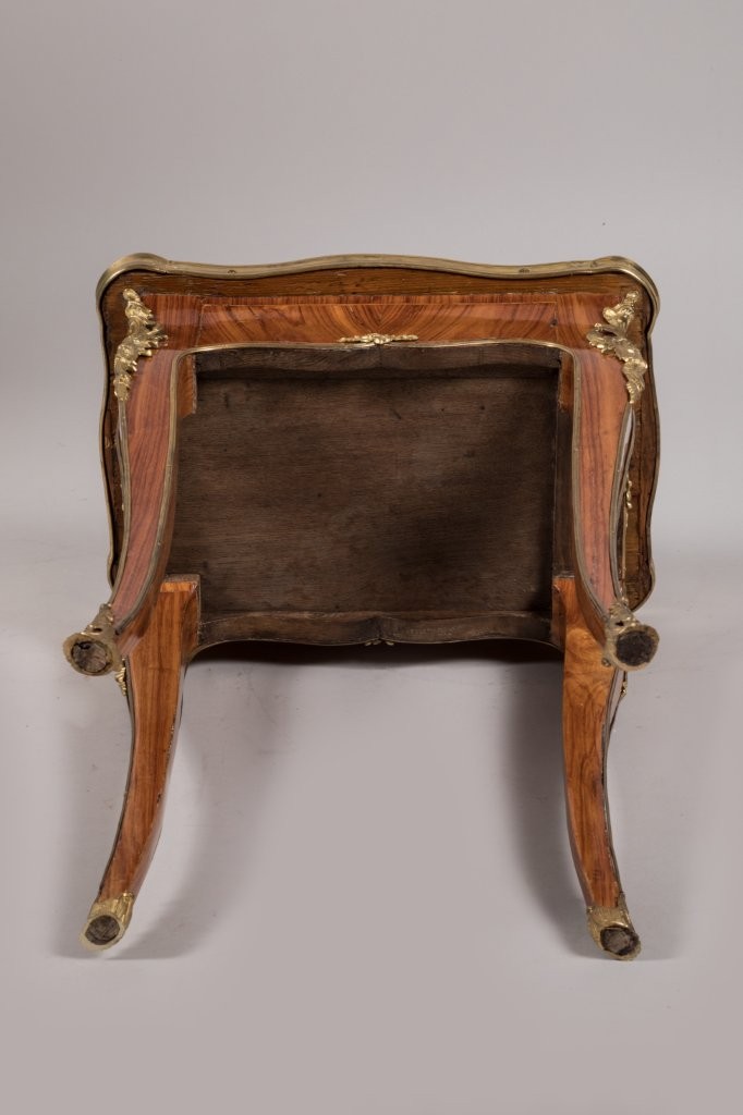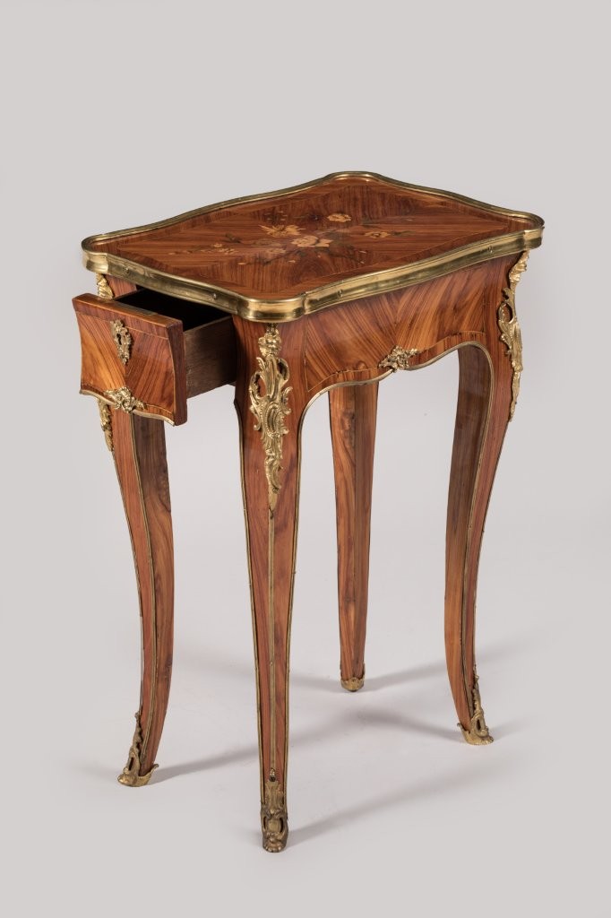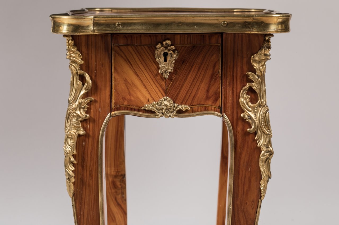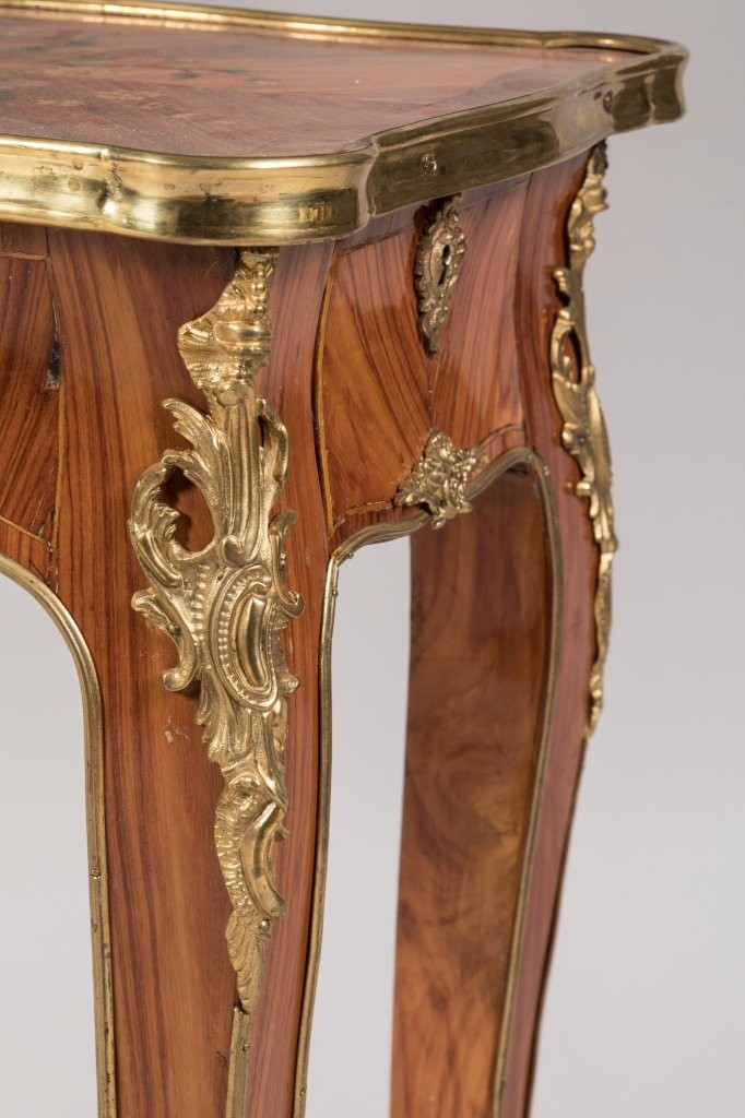 Le plateau, ceint d'une lingotière, est marqueté d'un décor de branches fleuries en buis et de bois vert sur un frisage de bois de rose. Elle ouvre par un tiroir latéral et repose sur quatre pieds légèrement galbés. Les chutes d'angles en forme de coquilles sur feuilles d'acanthe, l'entrée de serrure, les arêtes et les sabots en bronze doré sont marqués d'un "C couronné".