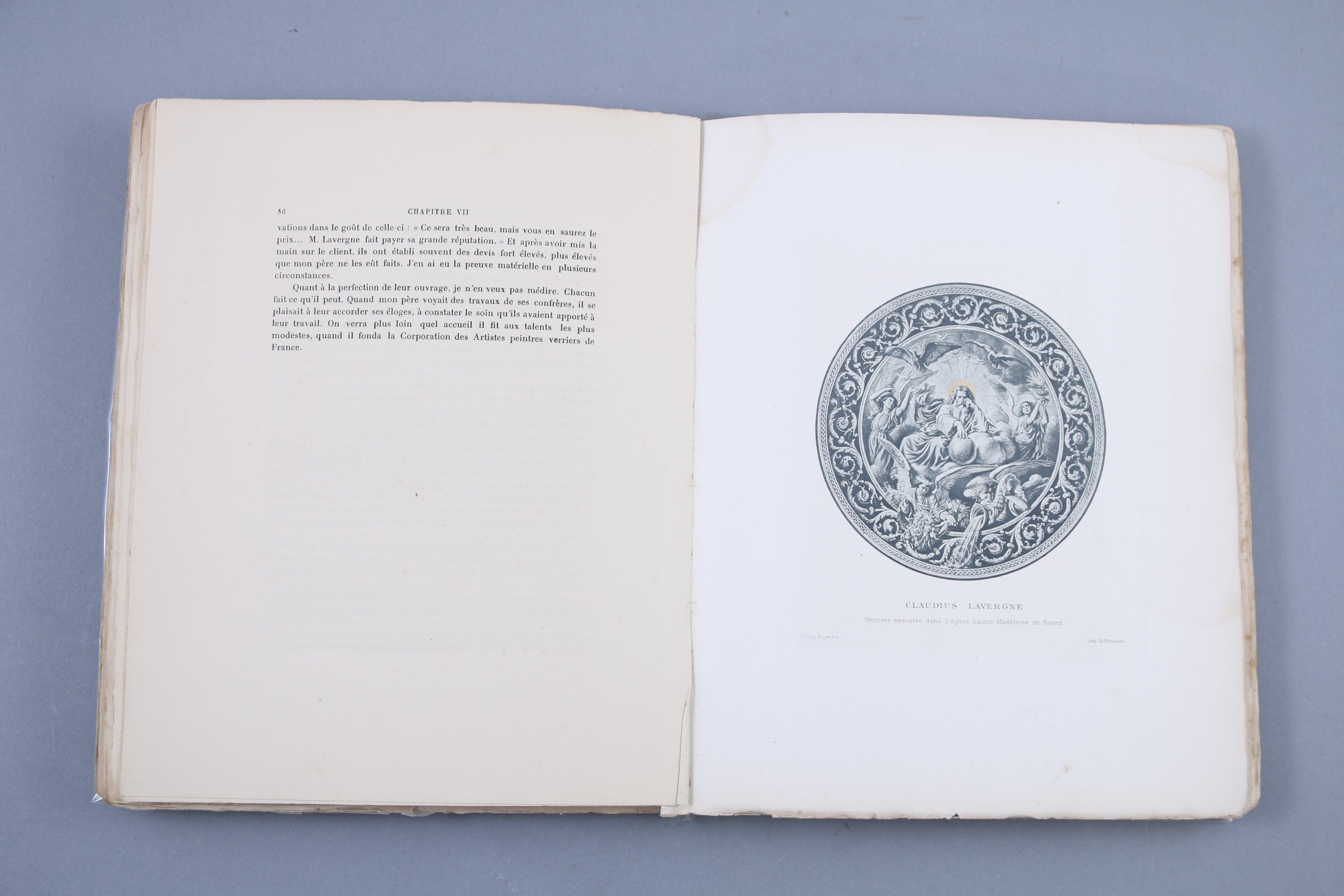 "Né à Lyon en 1815, Claudius Lavergne est formé à l’Ecole des Beaux-Arts de sa ville natale, puis rejoint l’atelier d’Ingres à Paris, qu’il suit ensuite à Rome. Il commence sa carrière comme peintre, spécialisé dans les sujets religieux, avant d’orienter progressivement sa pratique vers l’art du vitrail.