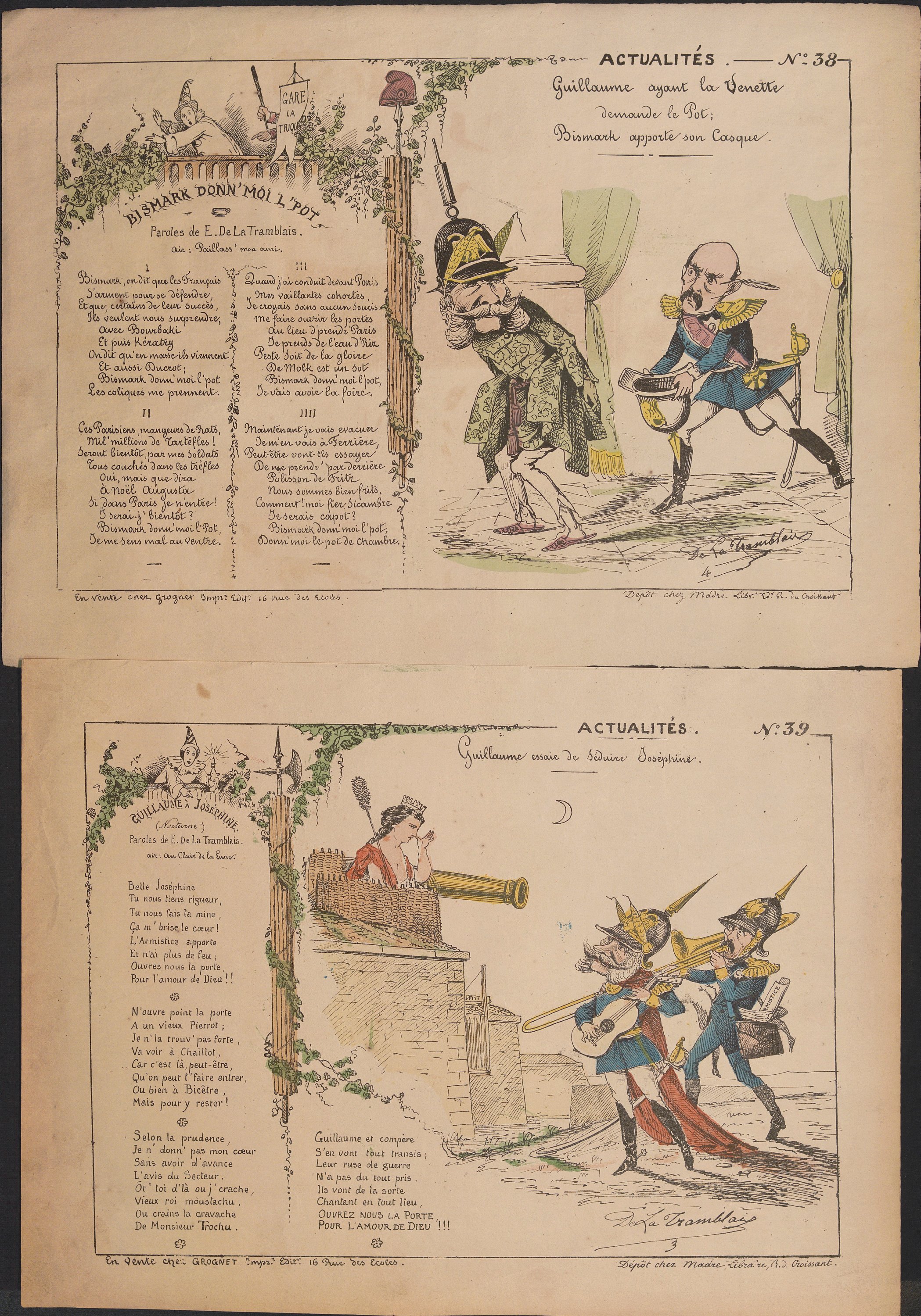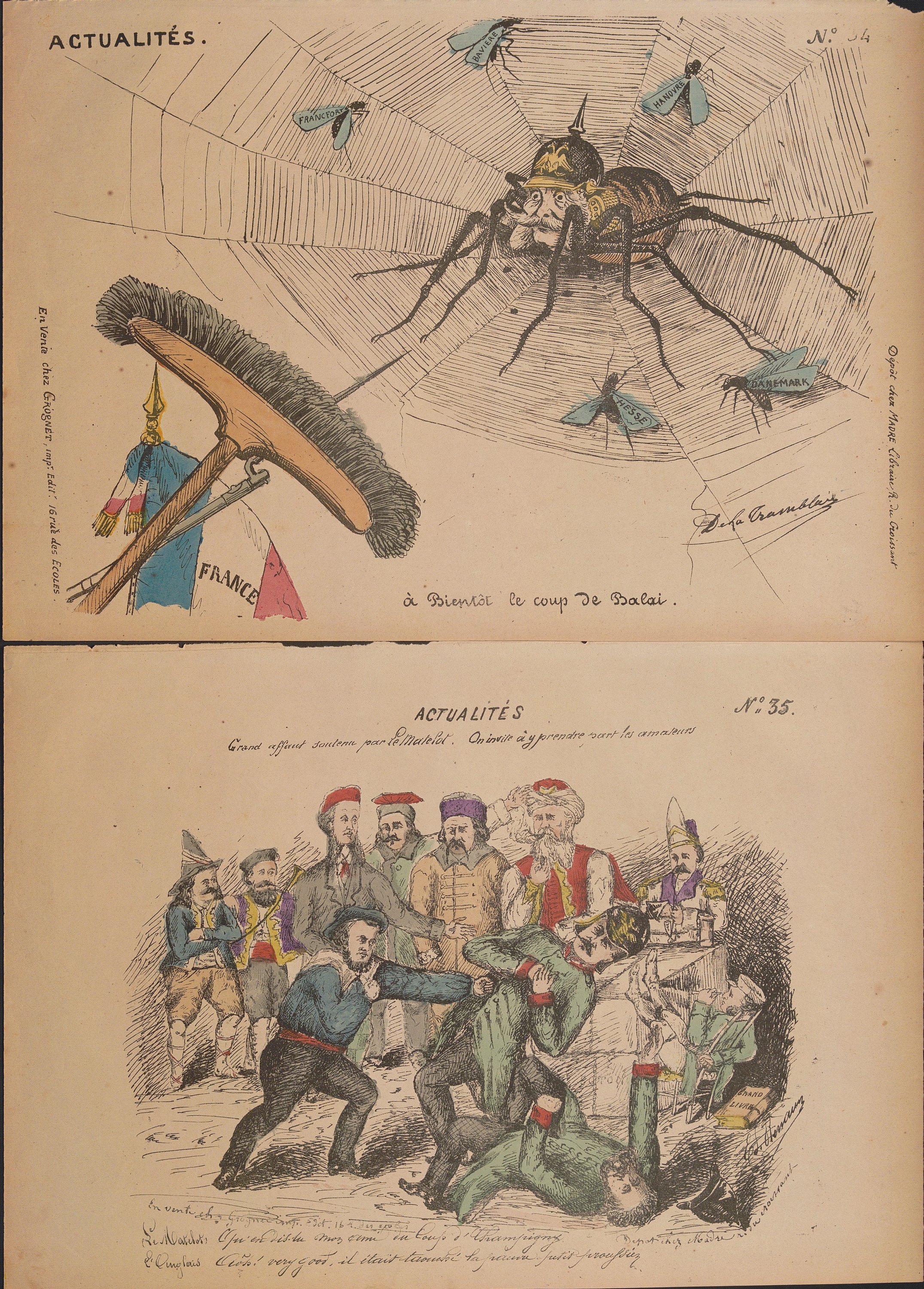 « Actualités », série quasi-complète n°1 au n°87 (mque 79, 80, 82, 83 et 87), formats divers ; feuilles volantes illustrées par différents dessinateurs/illustrateurs publiées et vendues dès le début de la guerre de 1870 jusqu’à la fin de la Commune de Paris ;