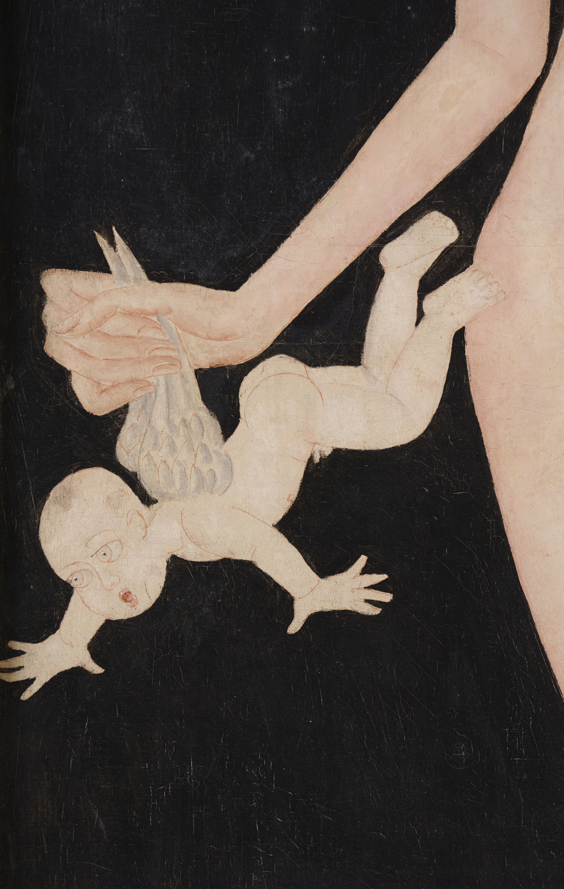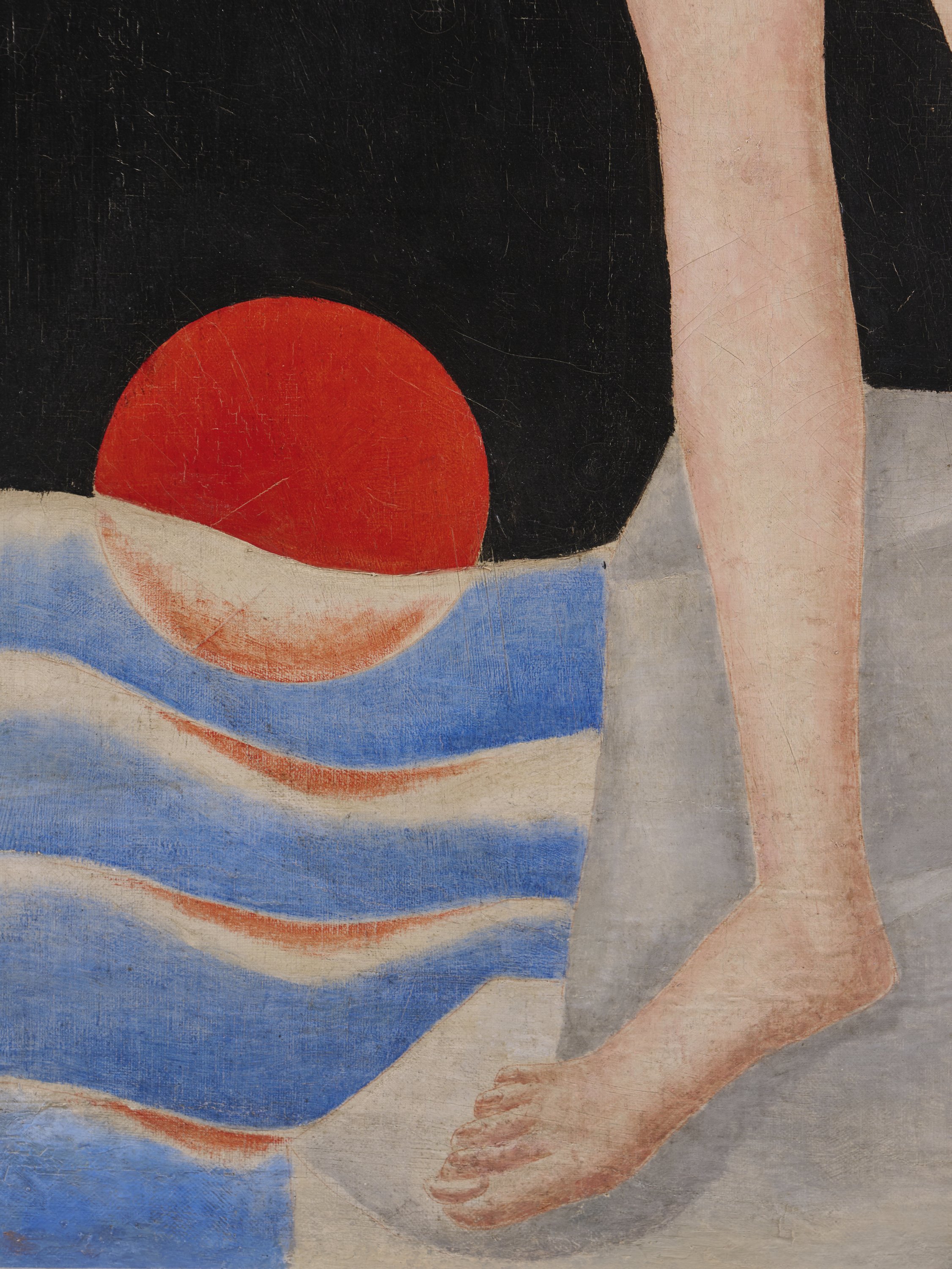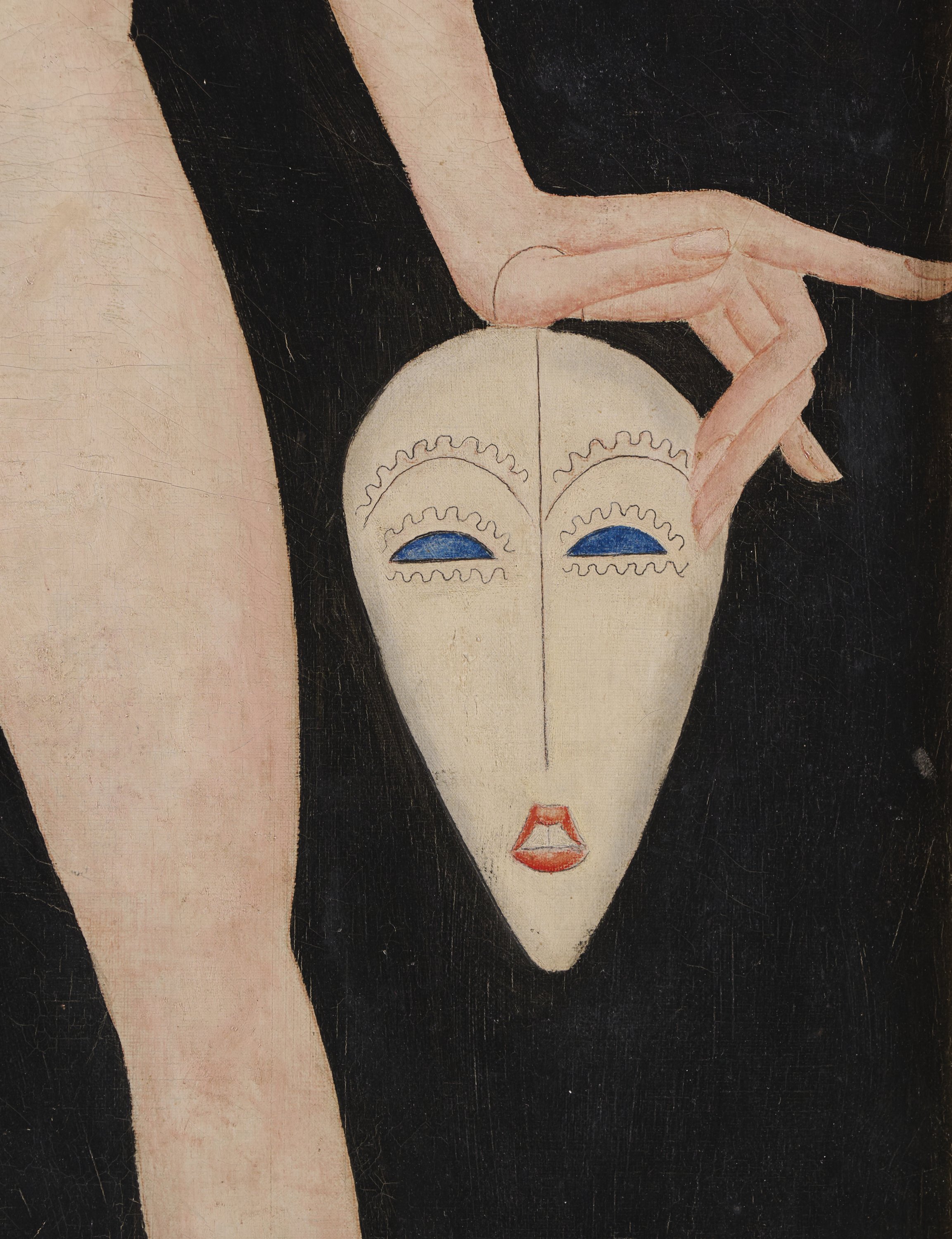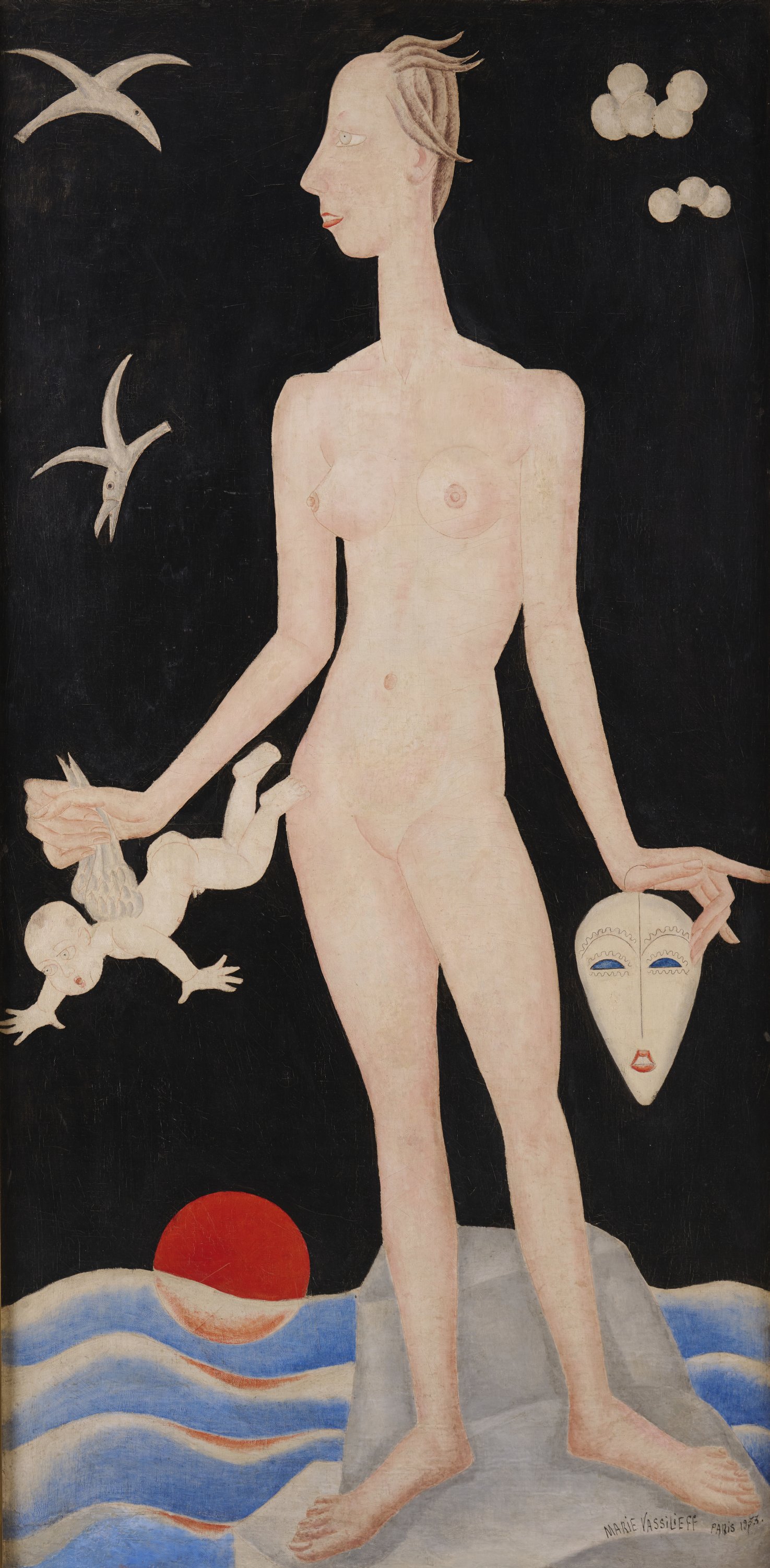 Juliette Germain est l’épouse du docteur Pierre-Raoul Germain, mécène et ami de Marie Vassilieff. Elle pose nue, debout, dans une frontalité absolue. Son allure de garçonne, sa carrure athlétique, son profil d’acier et son sexe glabre lui confèrent une présence statuaire que Vassilieff traite avec une économie de moyens radicale. Lauren Jimerson note que le corps de Juliette, réduit à une série de formes géométriques mouvantes, brouille délibérément les frontières entre anatomies masculine et féminine. Le tableau forme un diptyque avec la Moderne Salomé de 1931 : là où Eric jette la tête d’une femme dans les flammes, Juliette incarne la figure féminine renversée, ni mère ni épouse conventionnelle, mais une Eve sans péché originel. Ce n’est pas un portrait de commande : c’est une déclaration. Très exposée, cette œuvre est l’une des plus documentées de la collection Bernès.