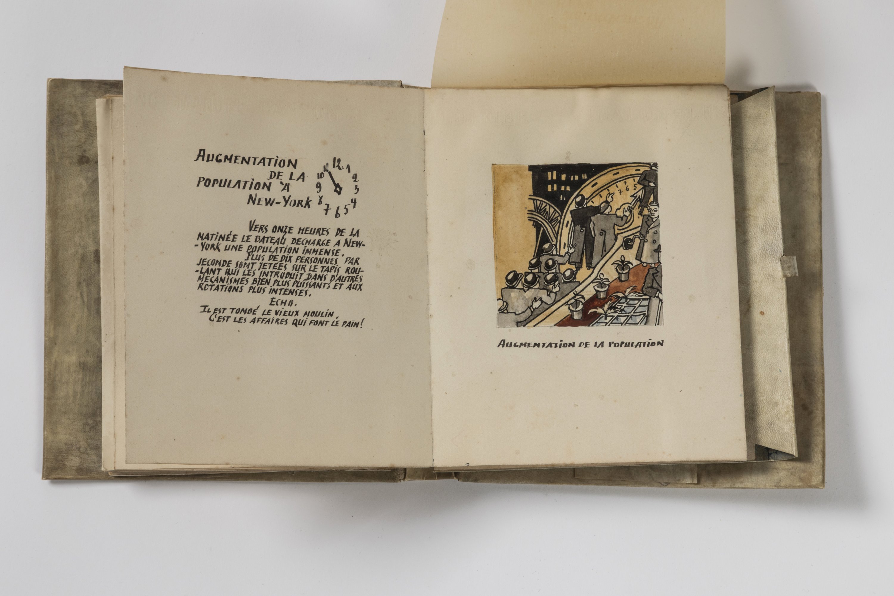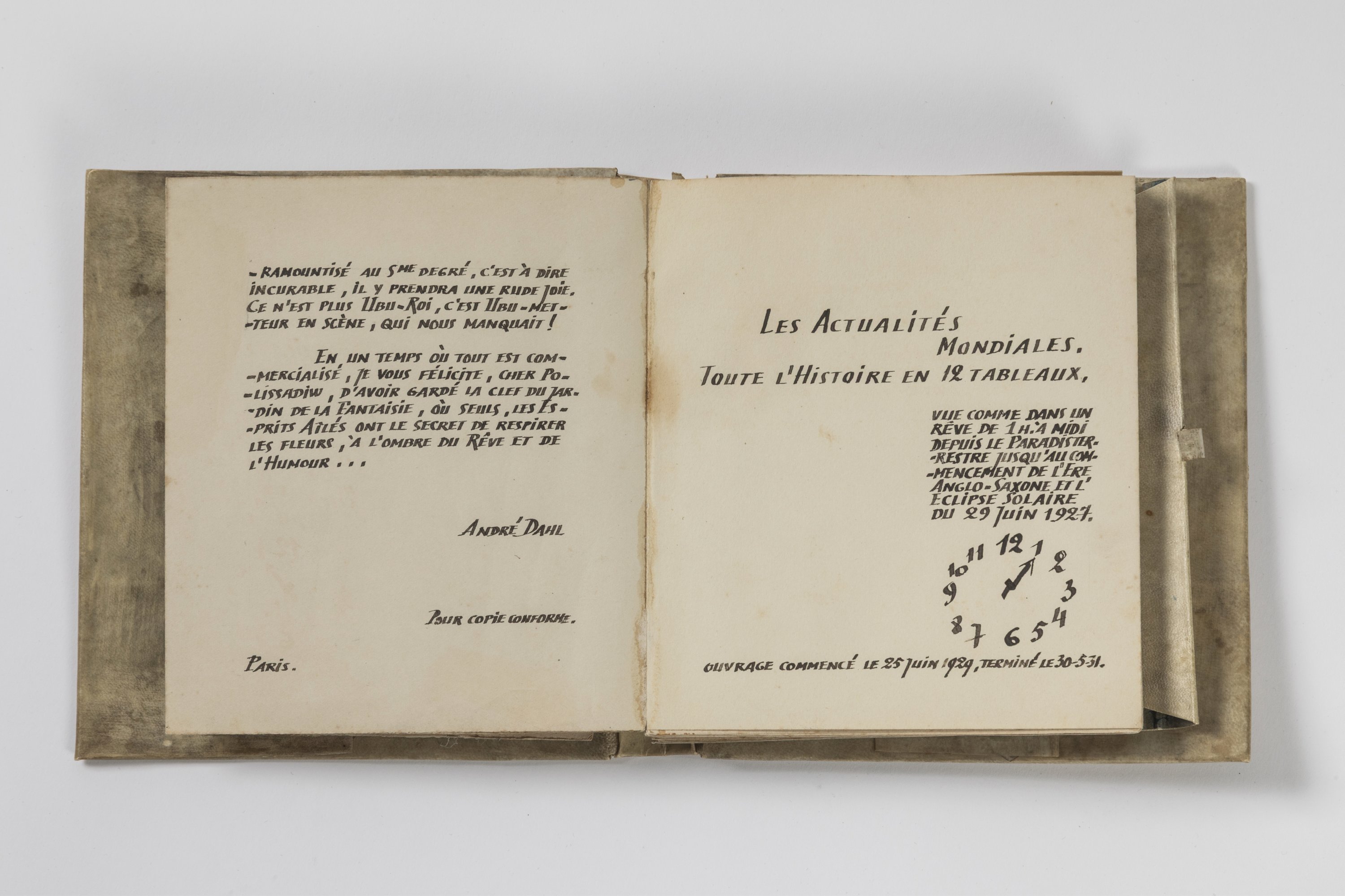 "Les actualités mondiales" est un exceptionnel manuscrit original, exécuté entre le 25 juin 1929 et le 30 mai 1931 au sein de la cité d'artistes "La Ruche" à Montparnasse. Il se décline en une introduction calligraphiée, une préface d’André Dahl, directeur de cabarets artistiques, et de 12 tableaux originaux accompagnés chacun d'un texte littéraire et satirique.