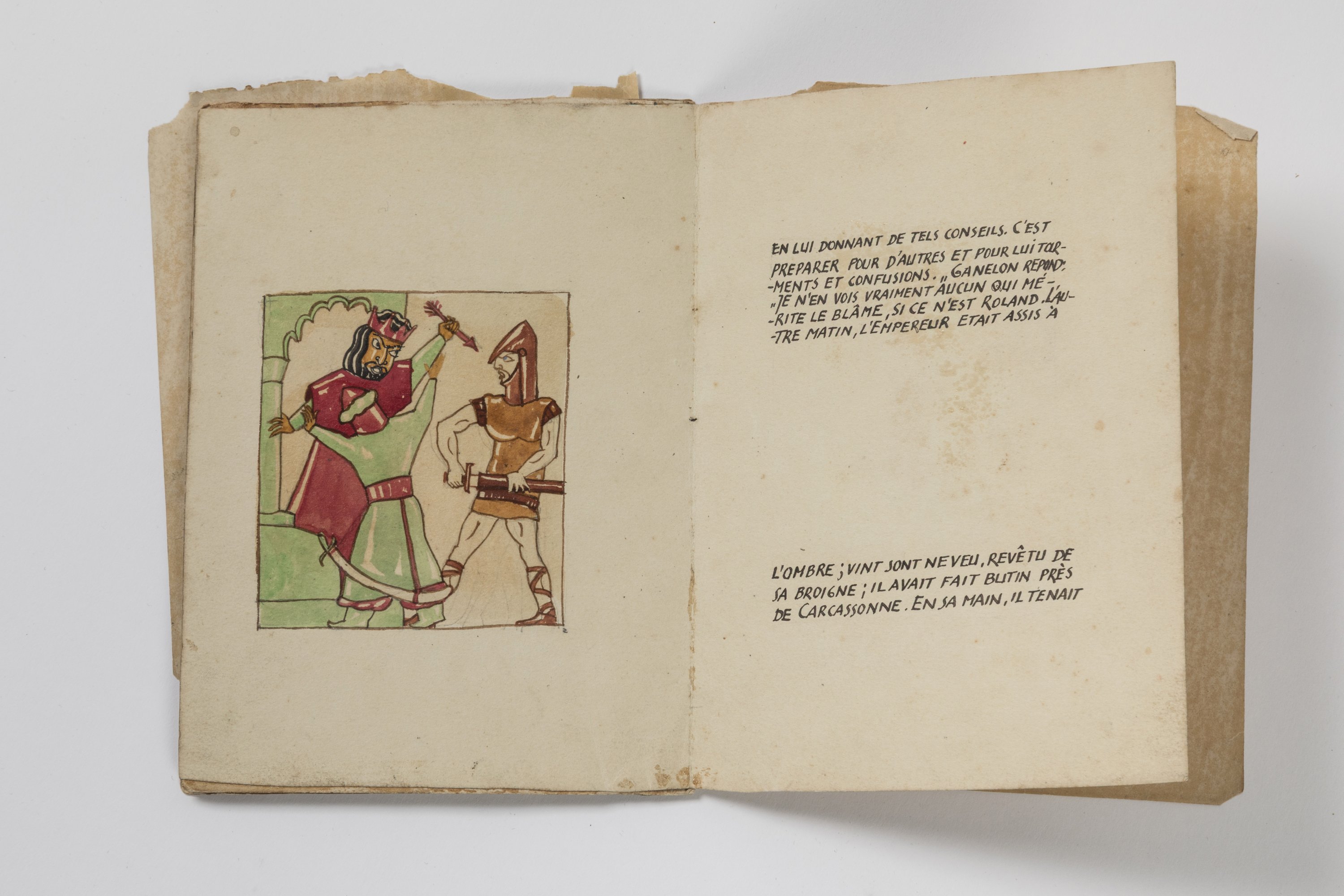 Manuscrit original illustré de 12 compositions dessinées et peintes, exécutées à l’encre de Chine, aquarelle, rehauts de gouache et vernis protecteur.