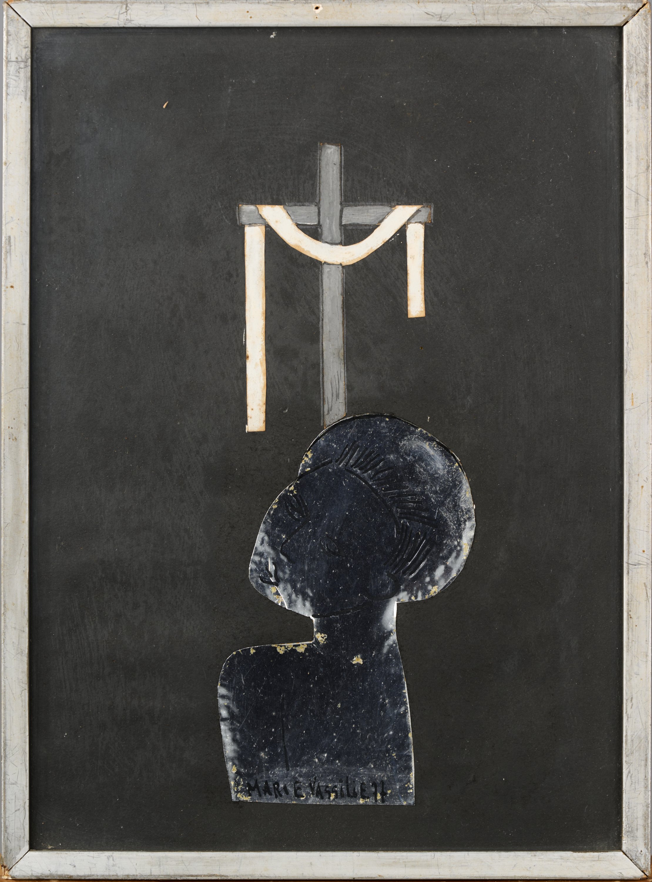 Papier argenté, encre, collage et gouache.
