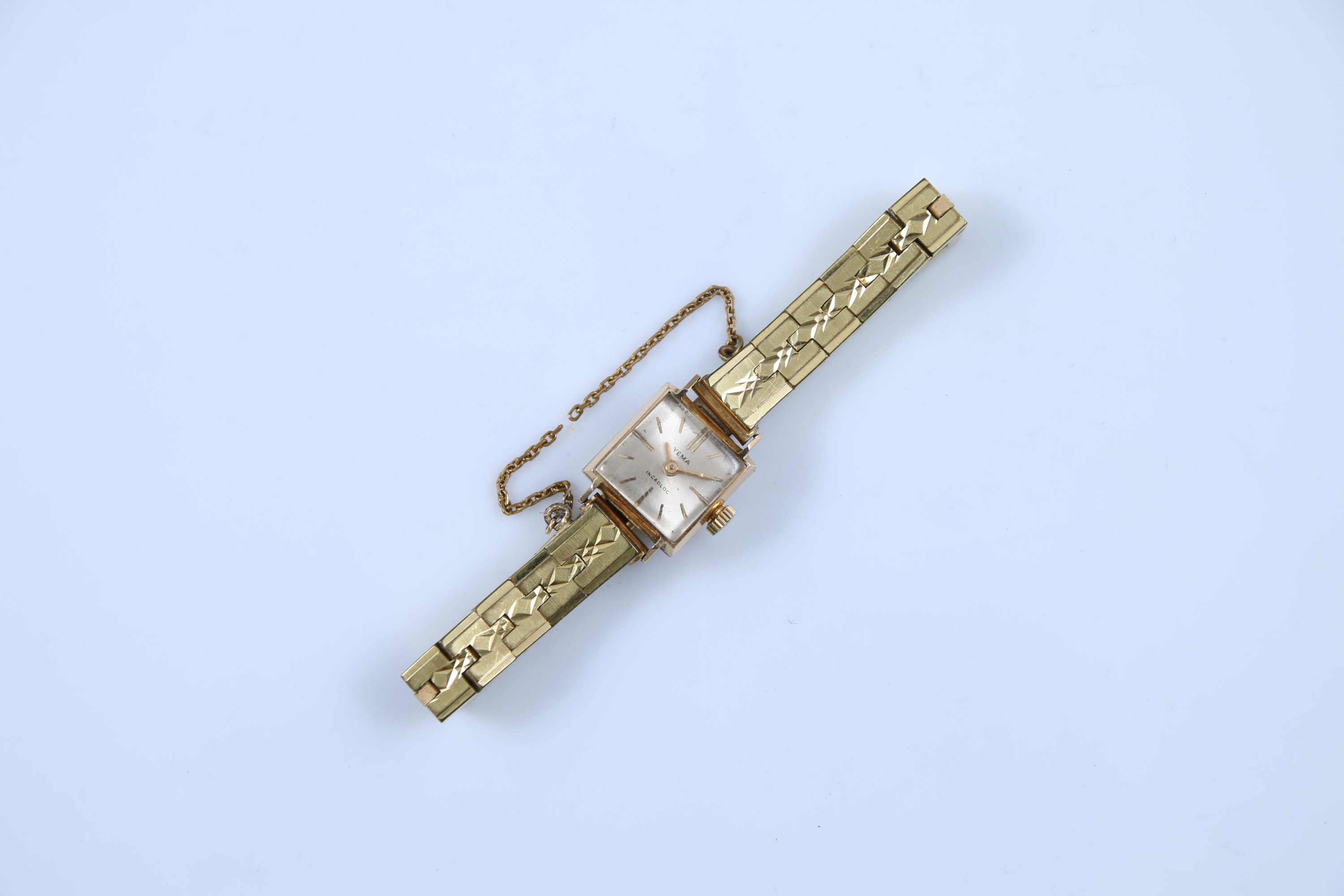 Le cadran rectangulaire gradué pour les heures. Remontoir à trois heures. Bracelet articulé en métal doré avec chainette de sécurité. Mouvement mécanique.