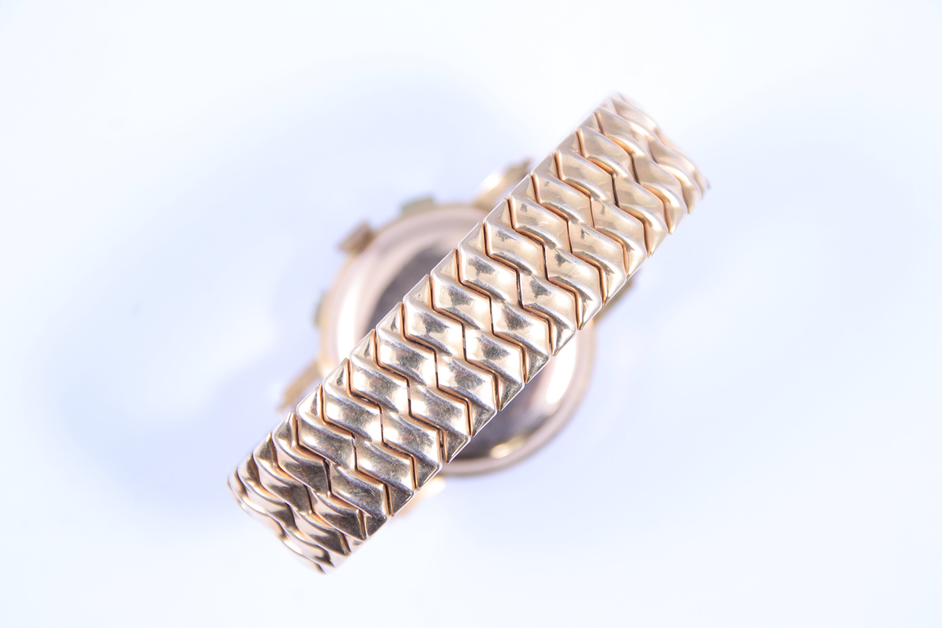 Le cadran champagne indiquant les heures en chiffres arabes, deux compteurs à 3 et 9 heures. Remontoir et boutons en métal doré. Bracelet en inox doré. Mouvement mécanique.