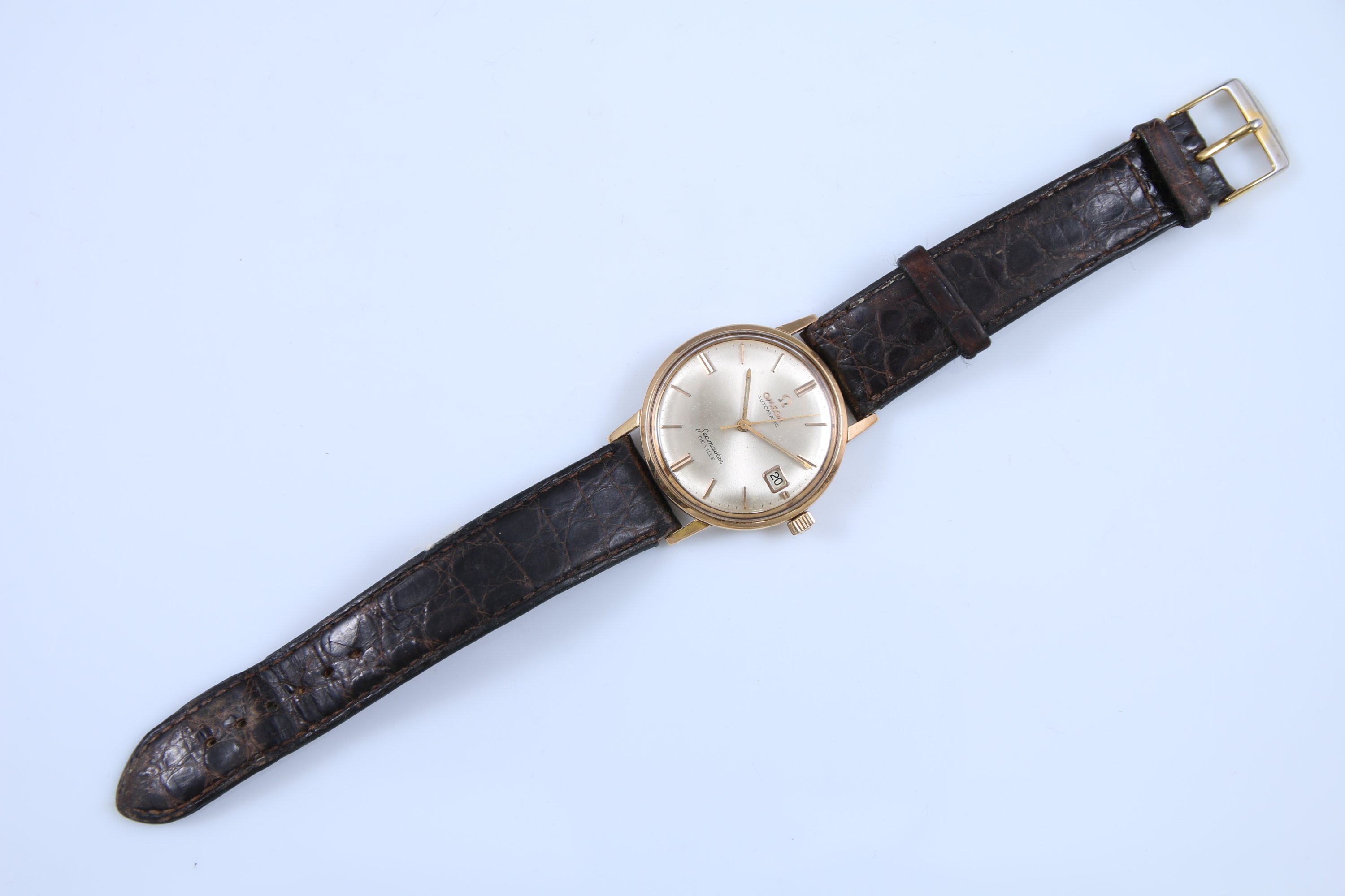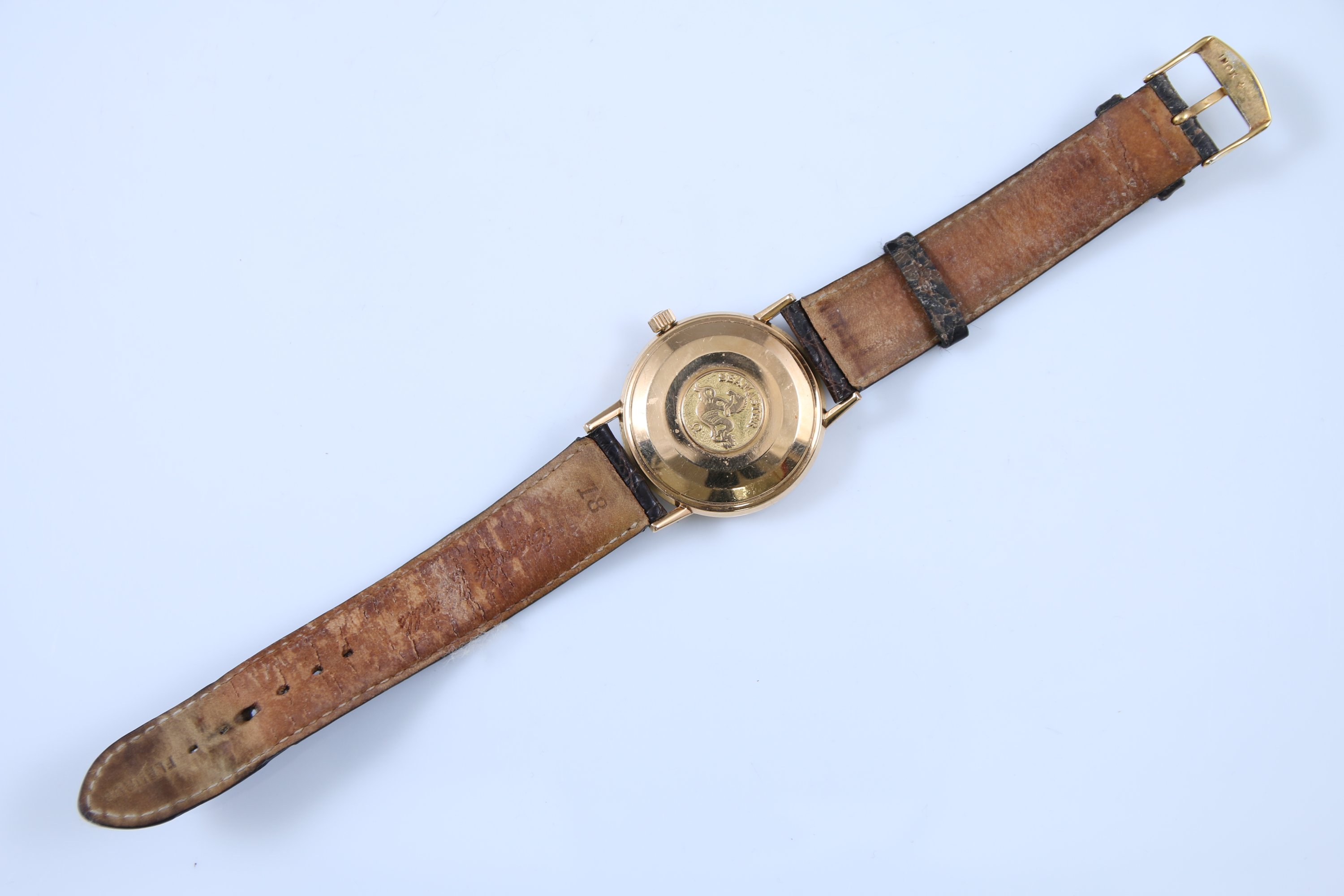 Le boitier rond au cadran satiné indiquant les heures par des index bâtonnets, trotteuse centrale, guichet dateur à trois heures. Le revers marqué "Seamaster" au décor d'un cheval marin.