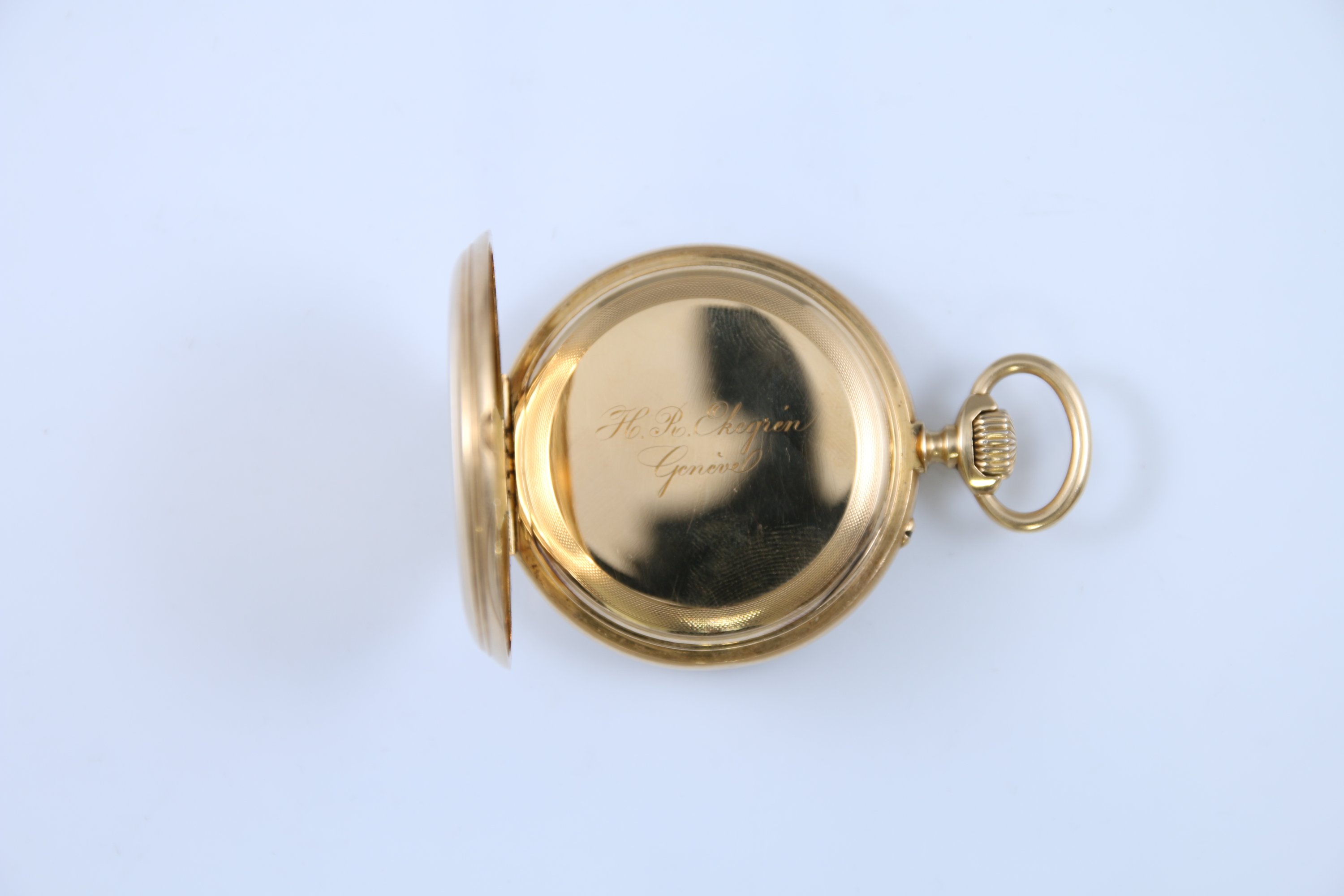 Le cadran émaillé blanc indiquant les heures par des chiffres romains. Petite trotteuse à six heures. Monogrammée "RE" au revers. Signée sur le cache-poussière "C.R Ekegren" et datée "1er janvier 1885", situé à "Genève". Numérotée "17875".