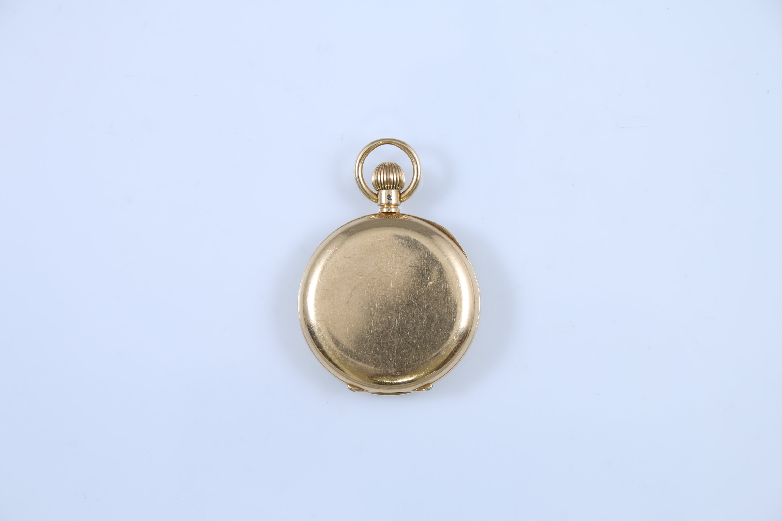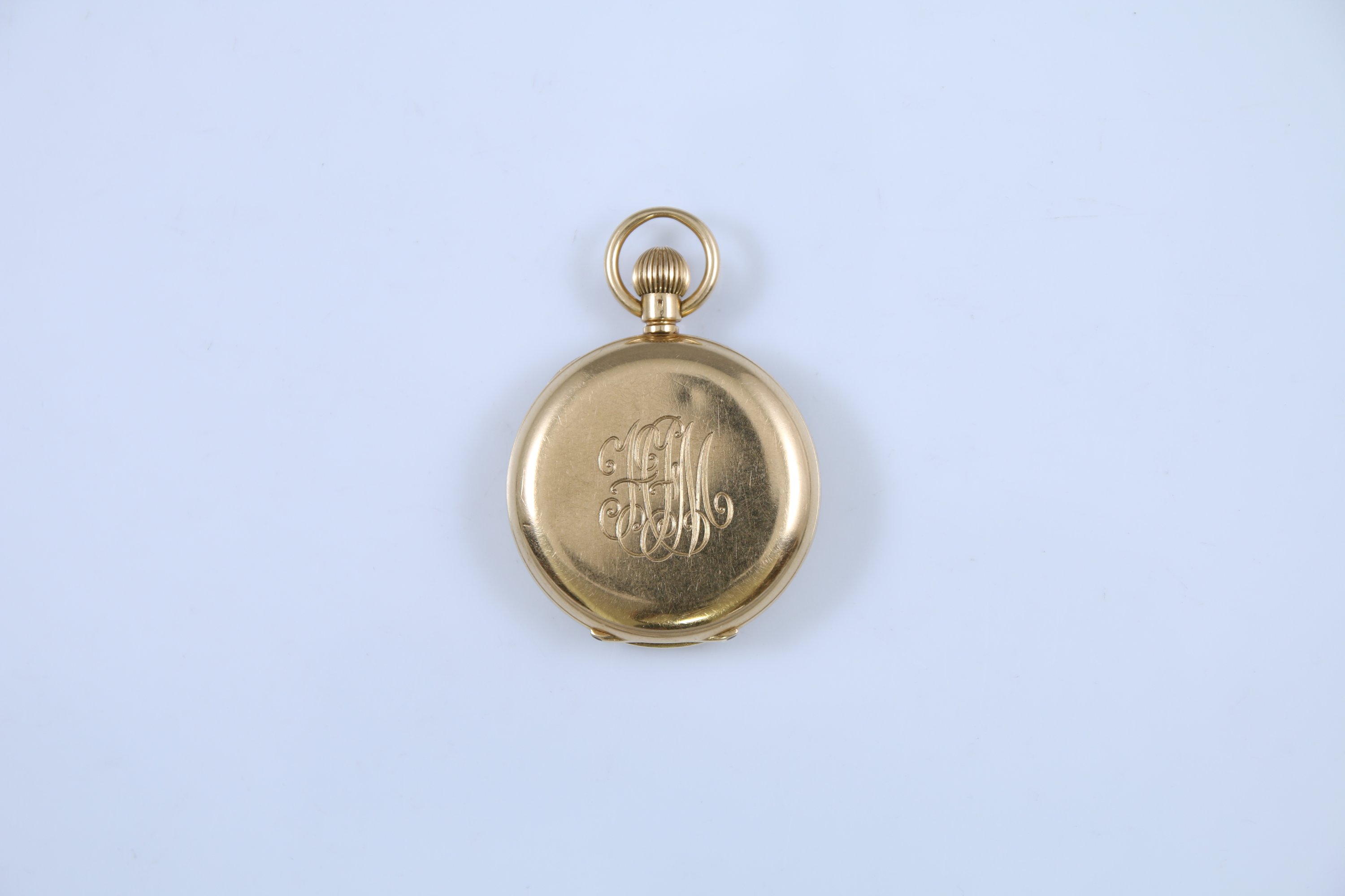 Le cadran émaillé blanc indiquant les heures en chiffres romains, les minutes par un chemin de fer. Le boitier monogrammée "HFM". Remontoir à midi. Cache-poussière intérieur en or jaune 750 millièmes.
