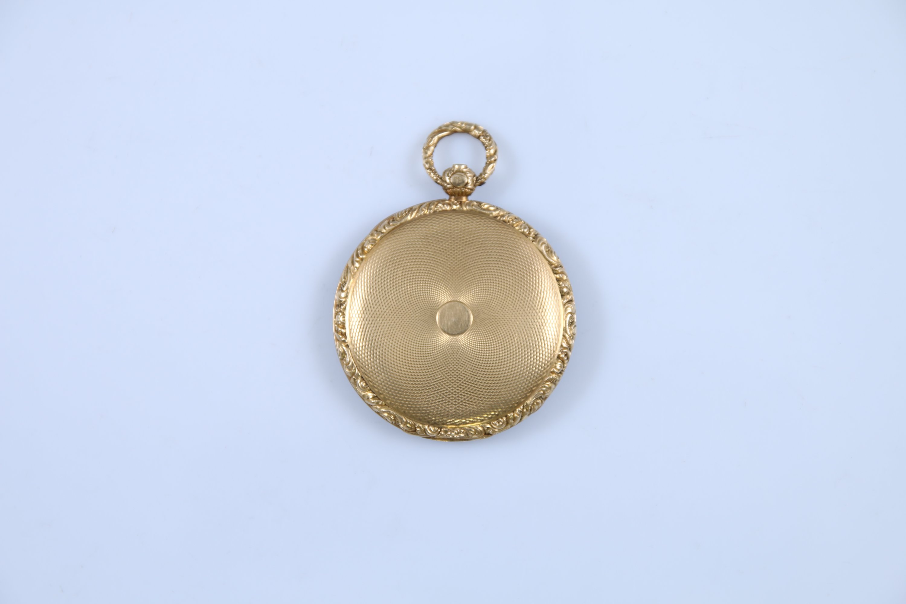 Le cadran argenté à fond guilloché indiquant les heures par des chiffres romains, les minutes par un chemin de fer. Le boitier à décor de rinceaux. Le revers guilloché. Le cache-poussière intérieur en or jaune 750 millièmes gravé "Marchand fils / à Tours" et numérotée "2049I". Remontage au revers.