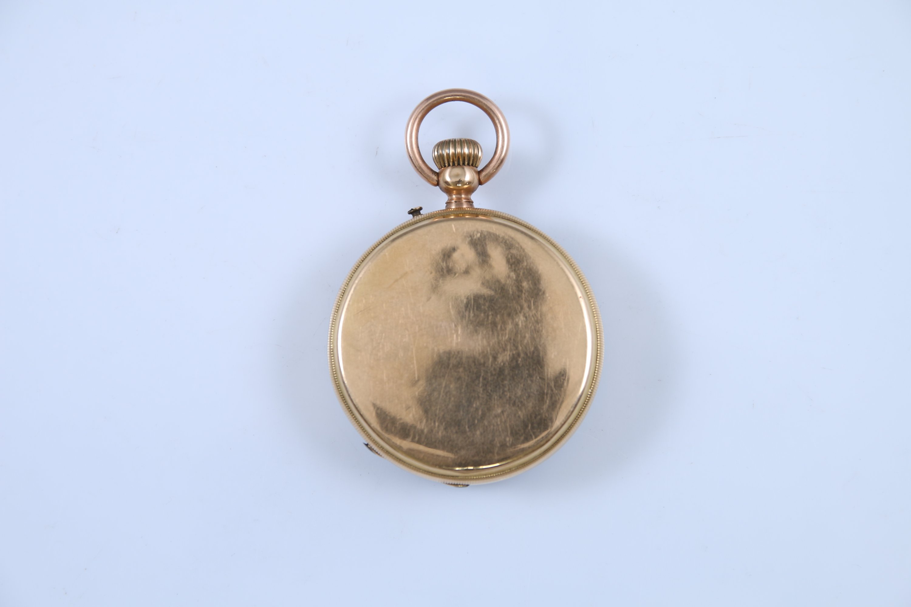 Le cadran émaillé blanc indiquant les heures en chiffres romains, les minutes par des bâtonnets et chiffres arabes. Petite trotteuse à six heures. Le cache poussière en or jaune 585 millièmes gravé "remontoir au pendant / Ancre / 15 rubis". Remontoir à 12h.