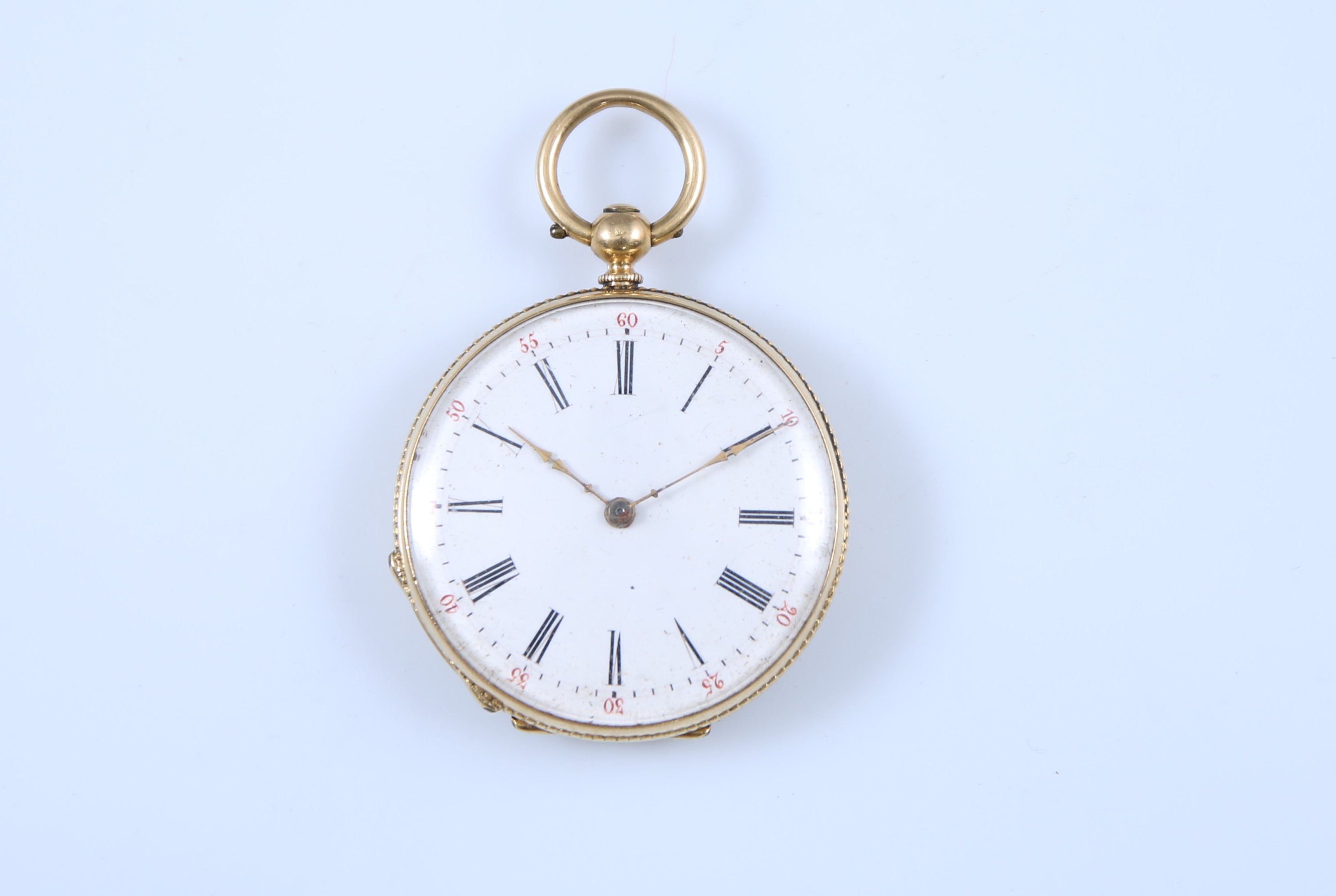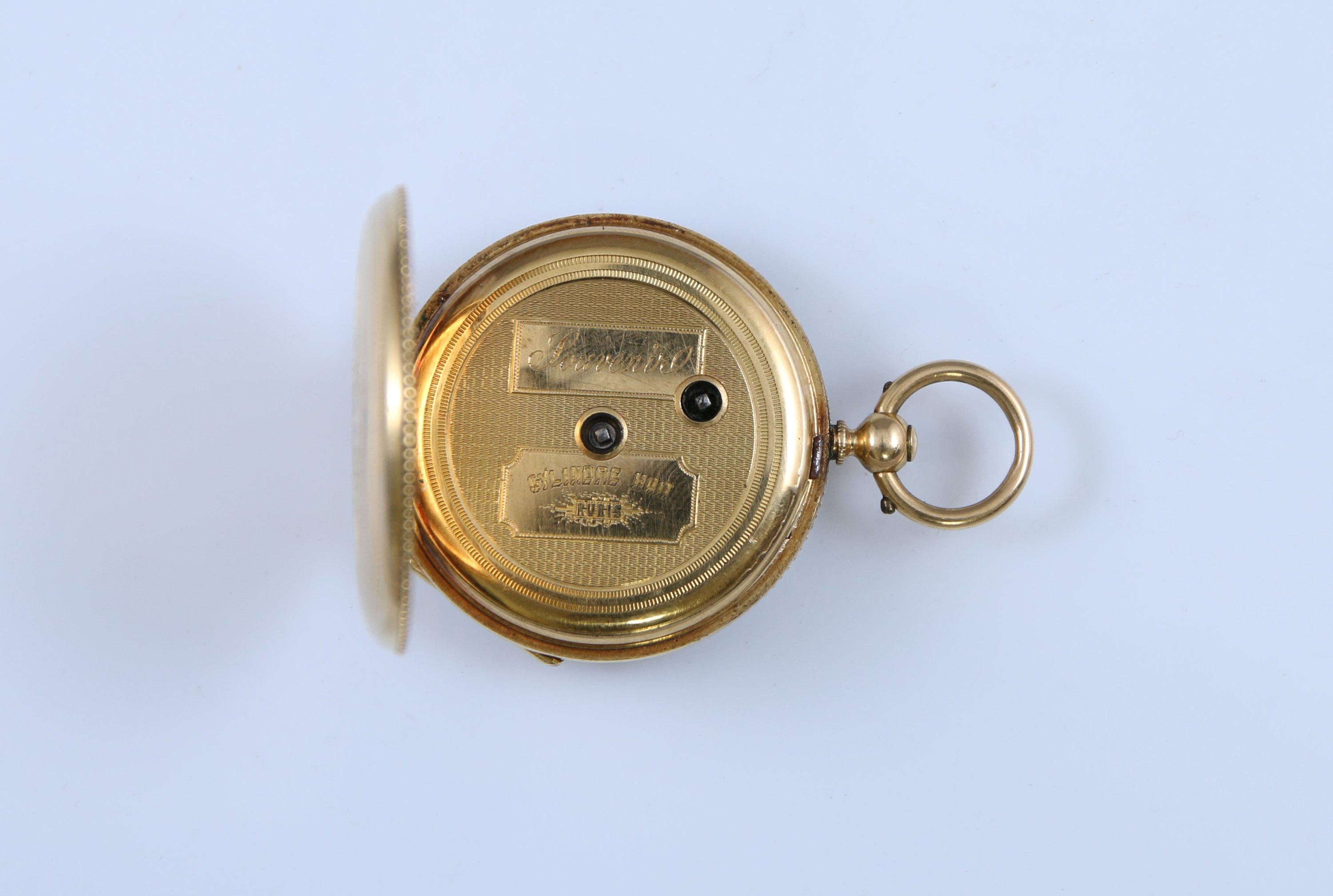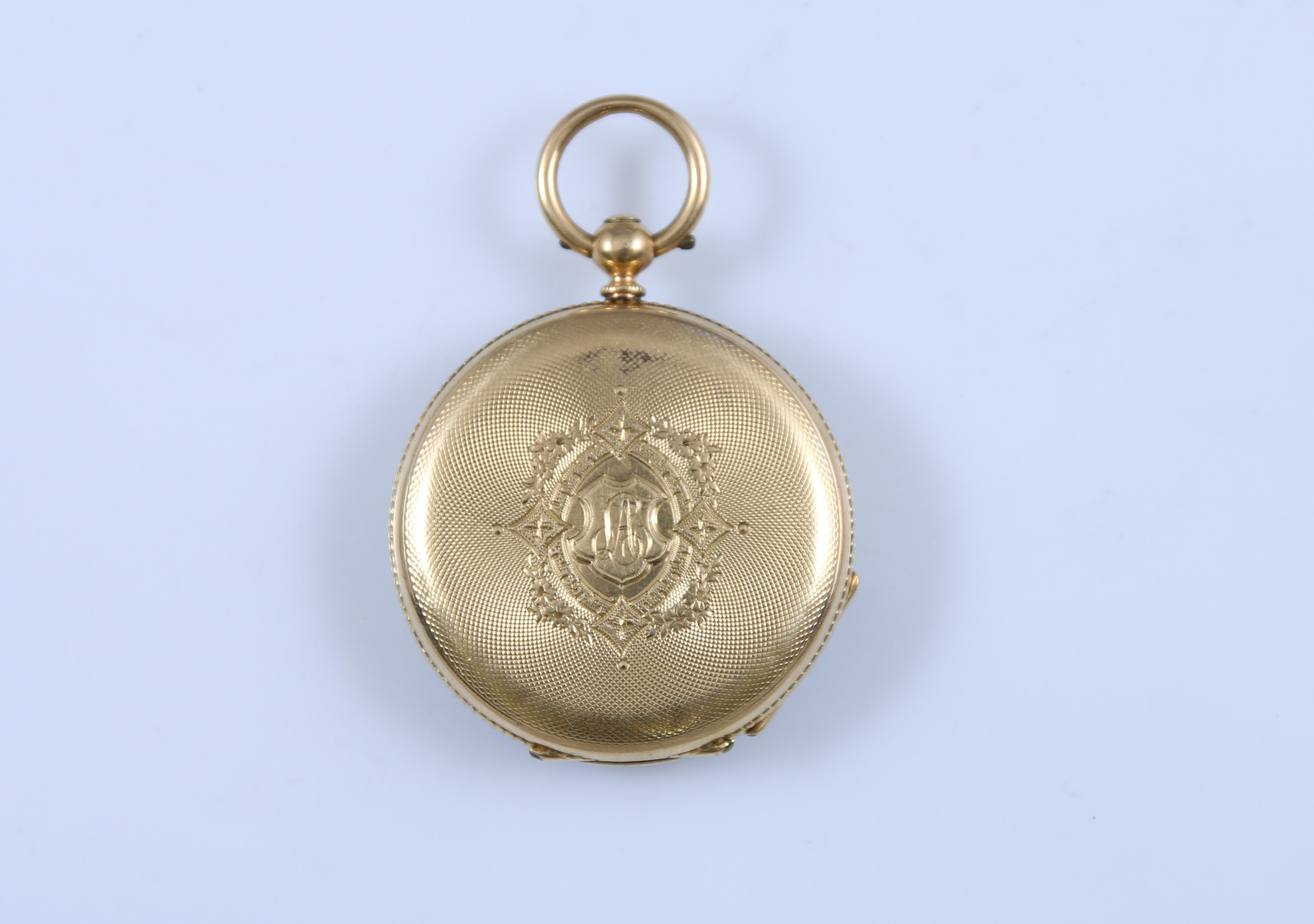 Cadran émaillé blanc indiquant les heures en chiffres romains. Le revers du boitier monogrammé "LA" sur fond guilloché. Cache-poussière en or jaune 750 millièmes. Bélière.