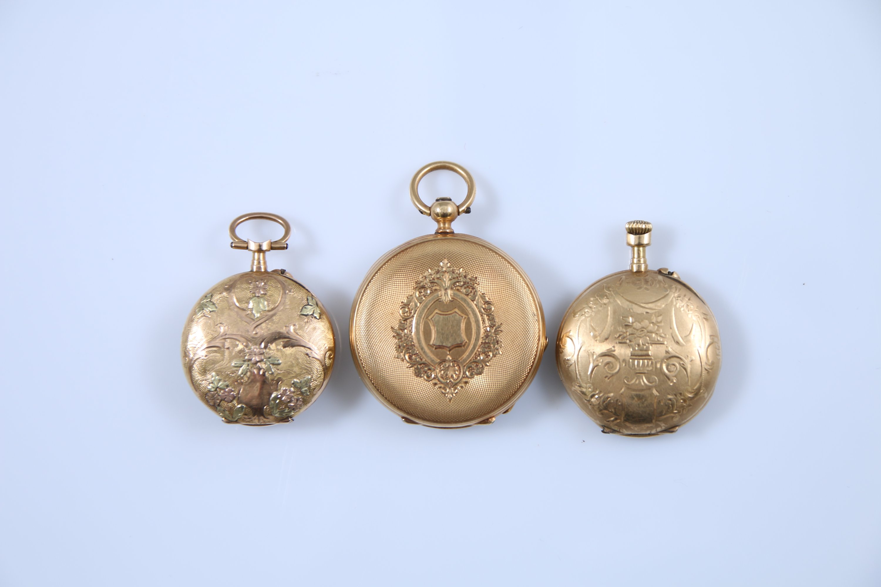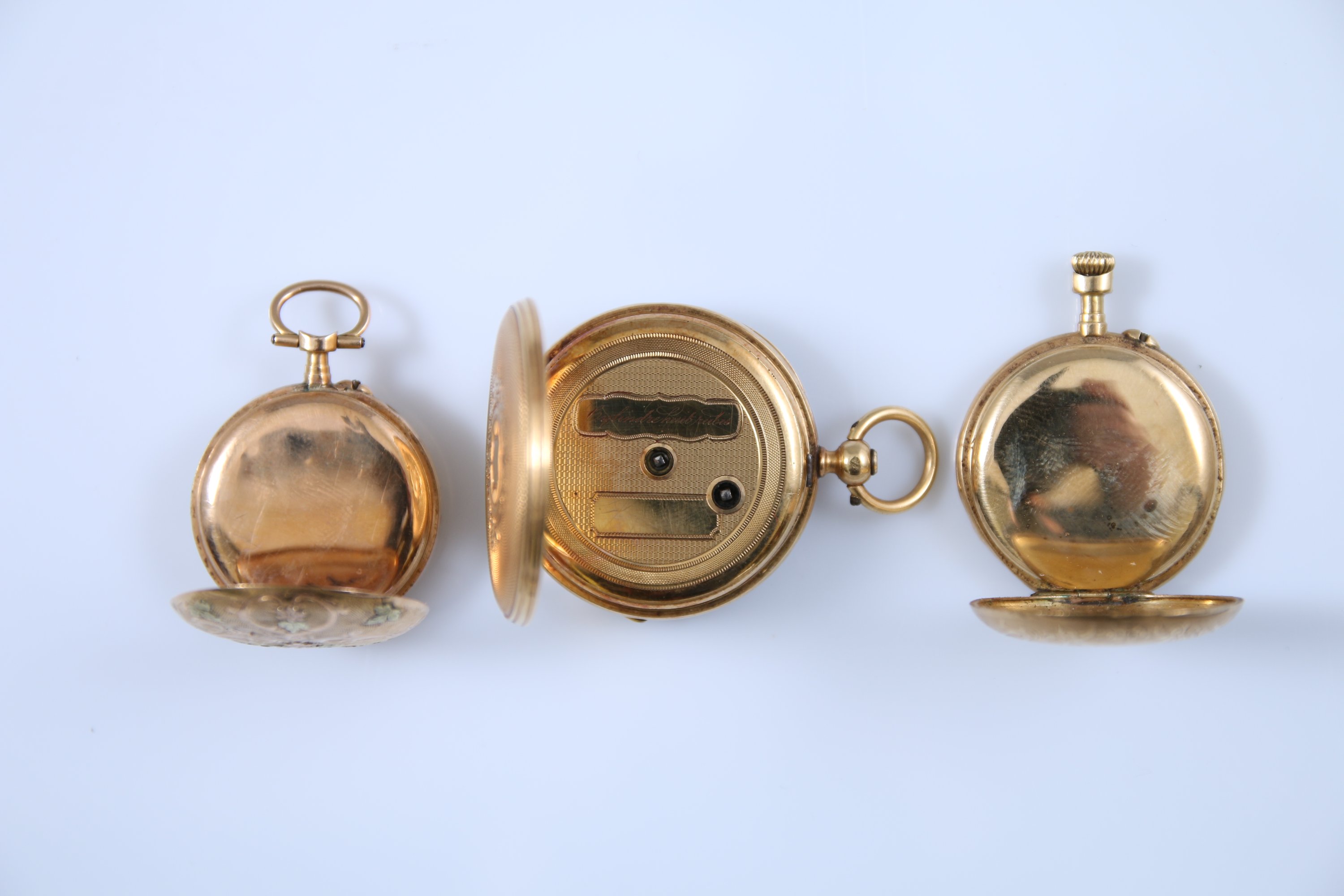 Chacune à cadrans émaillés blanc, dont deux indiquant les heures en chiffres romains et l'une en chiffres arabes. Les revers gravés et guillochés.