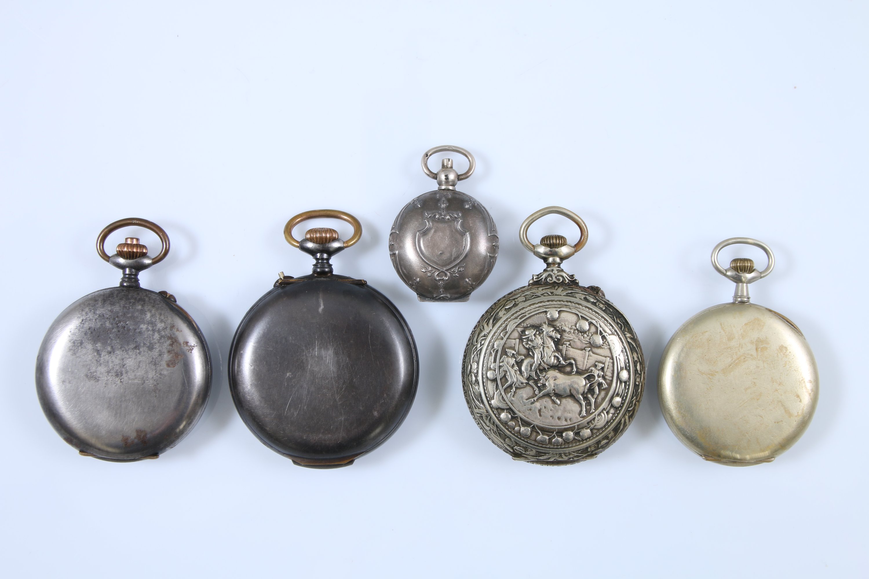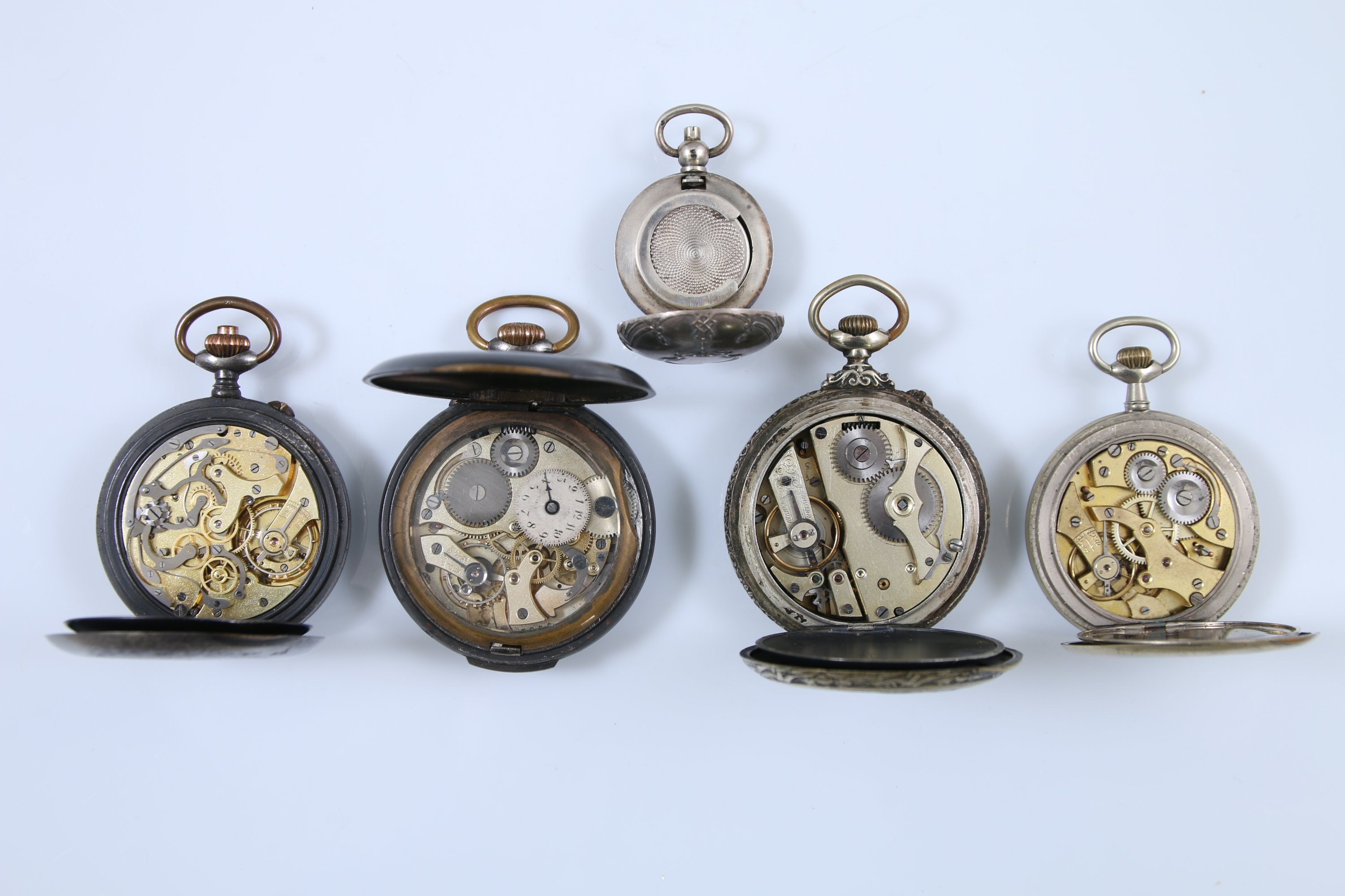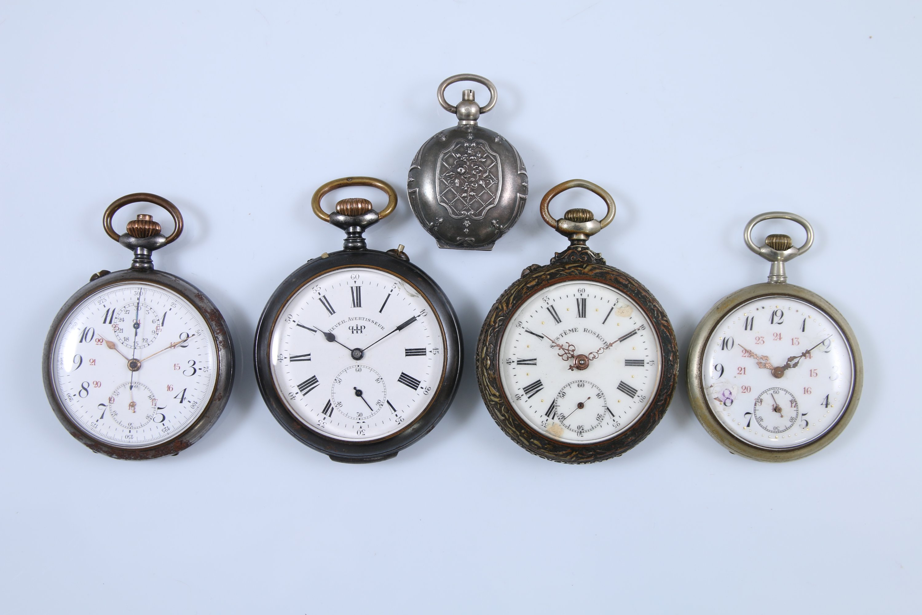 - quatre montres de poche en métal à cadrans émaillés blancs.