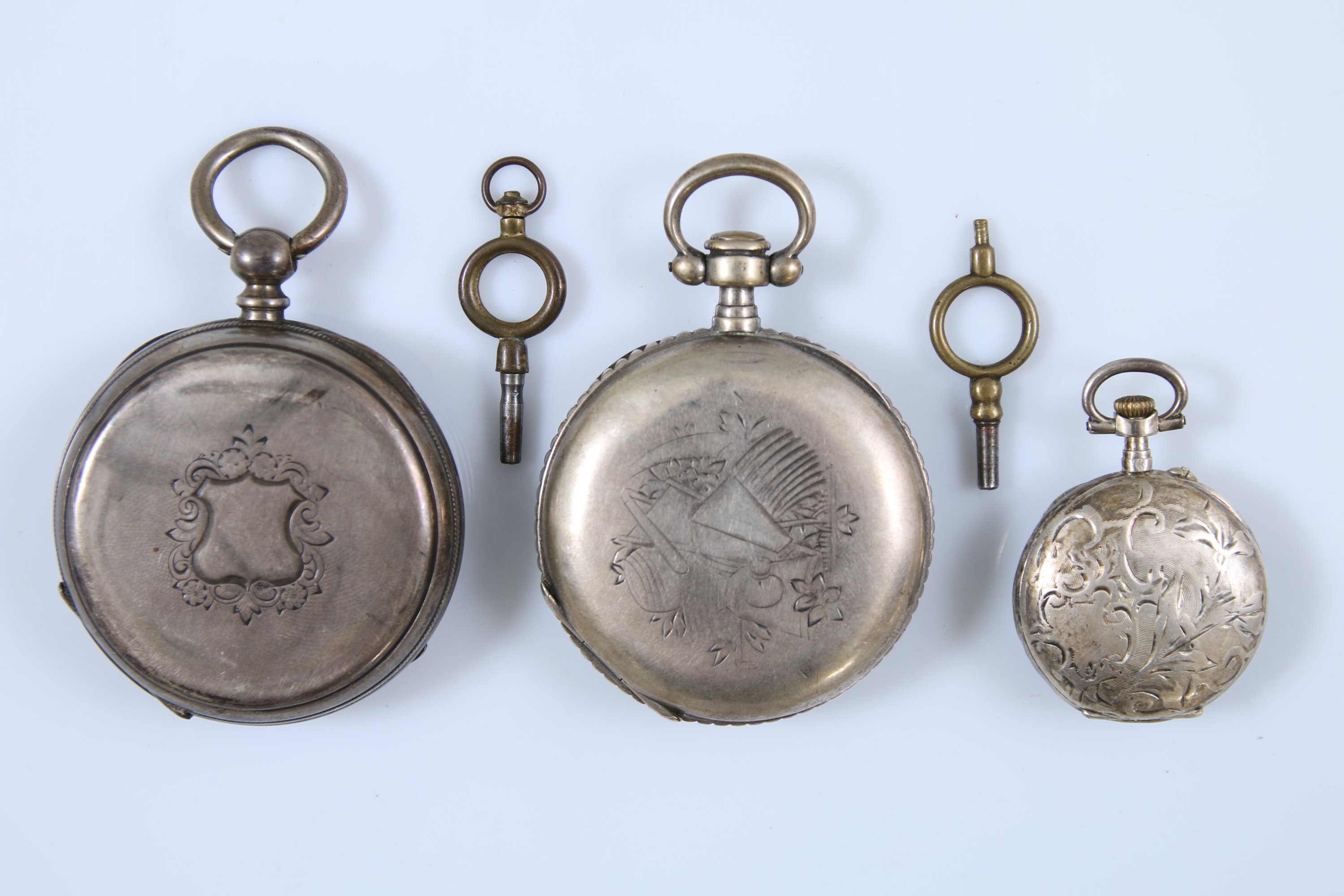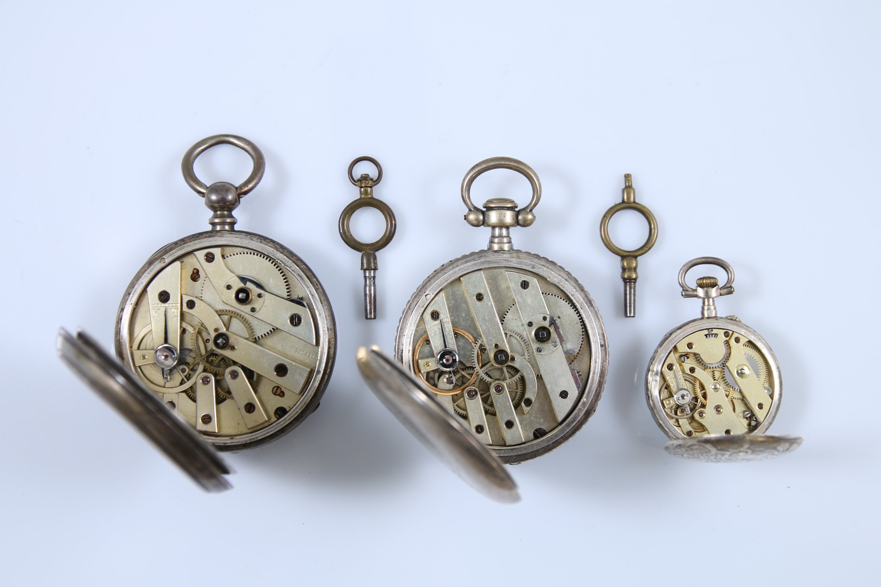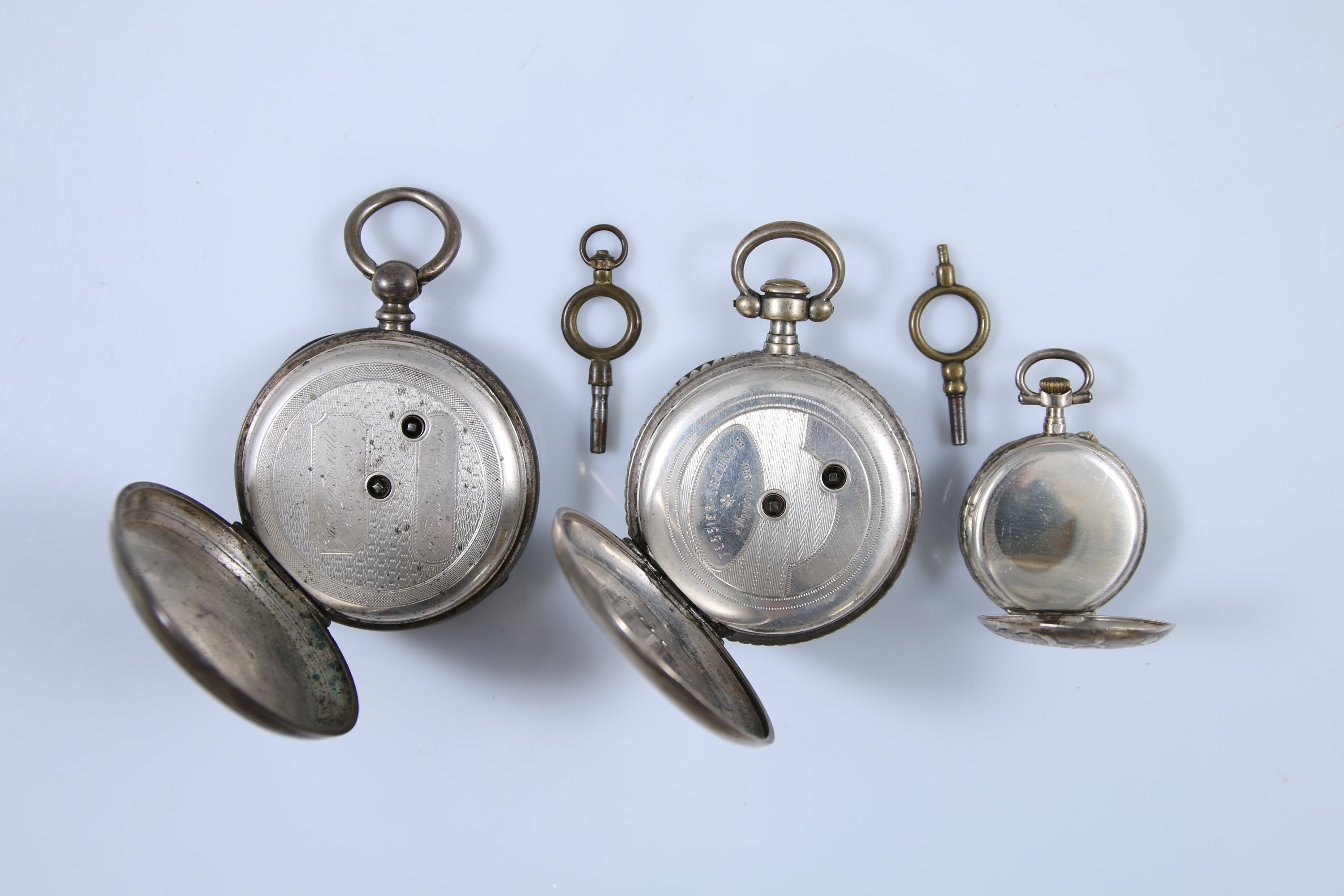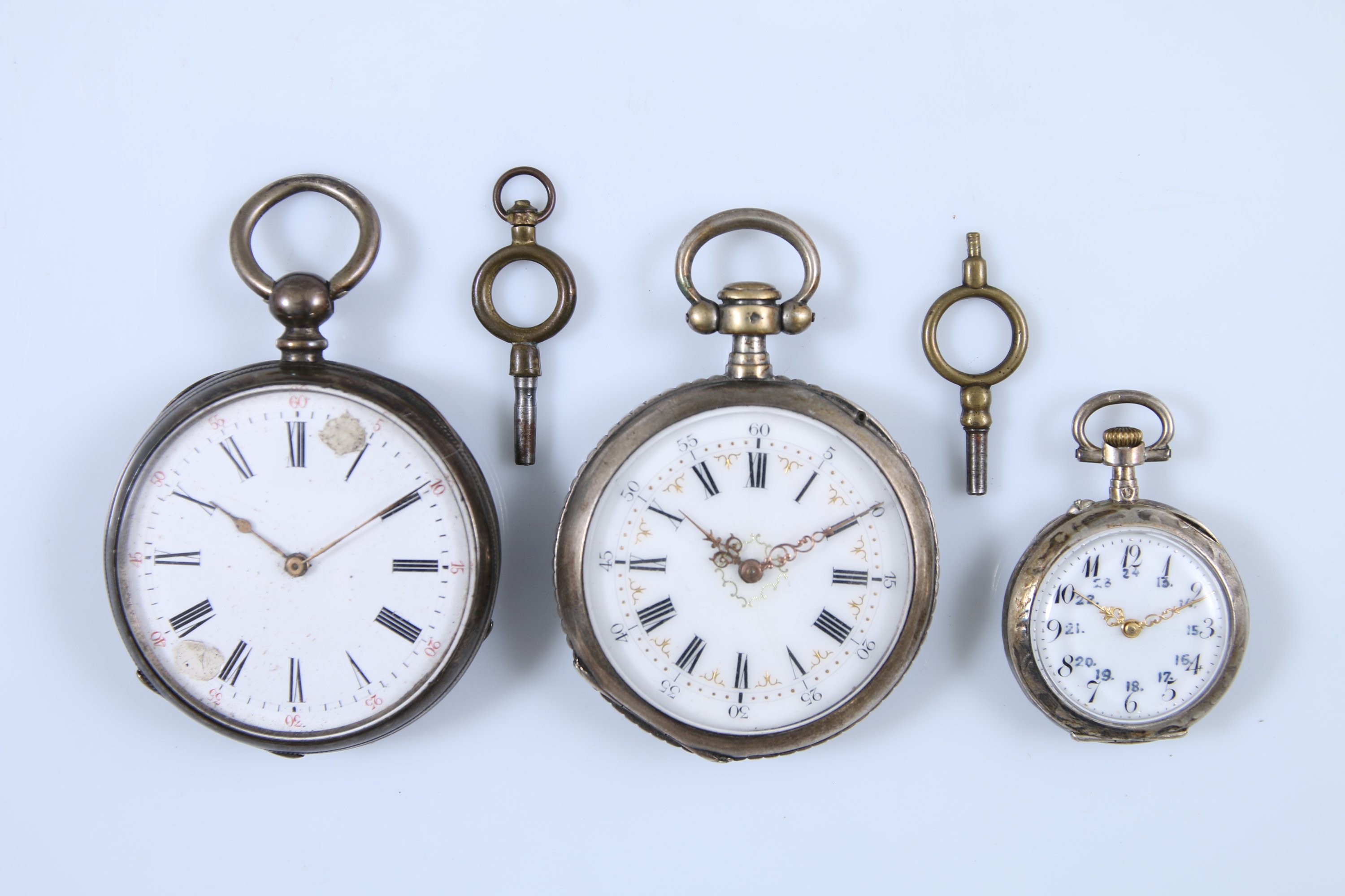 - quatre montres de poche en métal à cadrans émaillés blancs.
