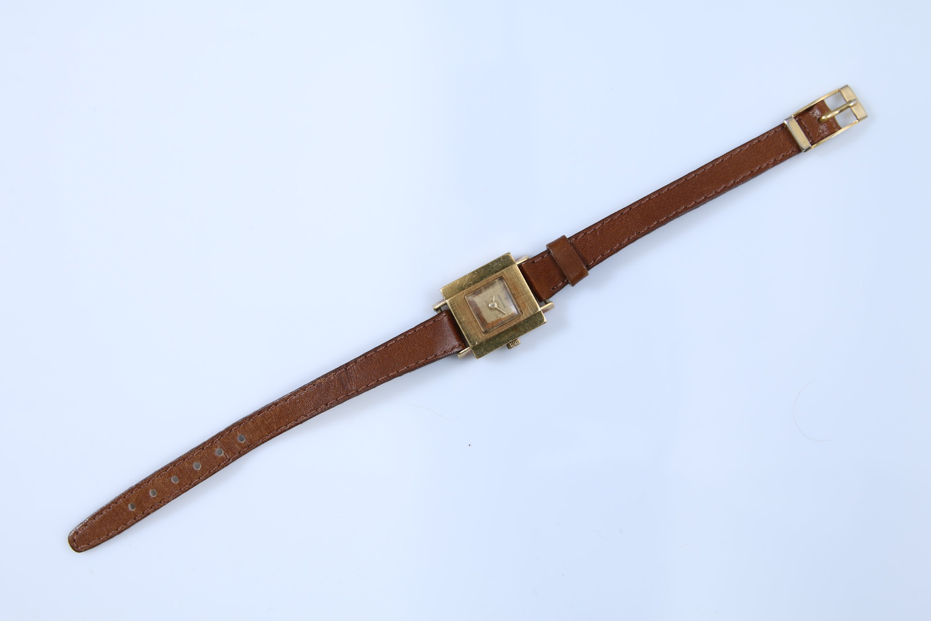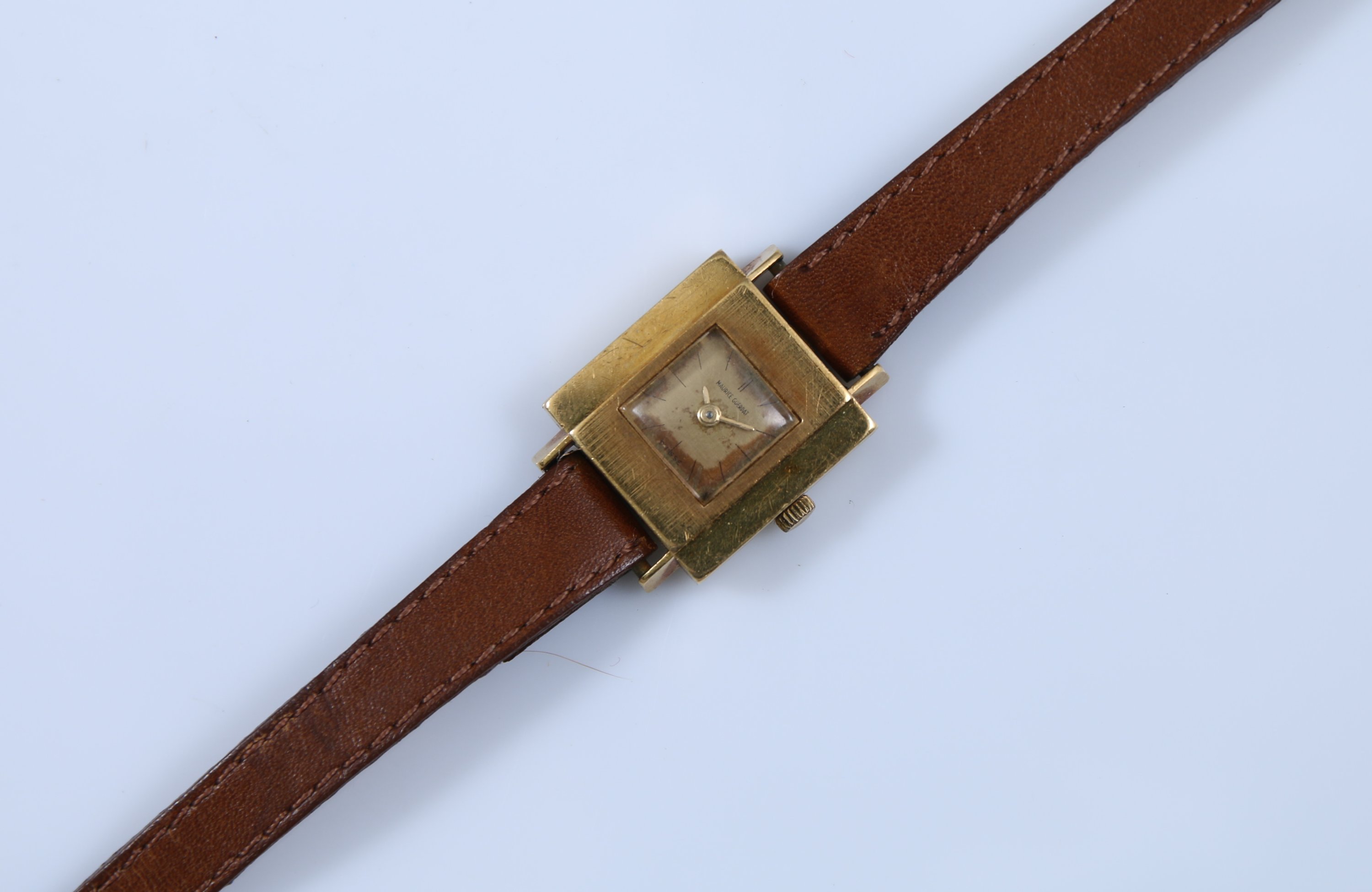 Or jaune 750 millièmes de forme carrée, remontoire à trois heures, le cadran signé Maurice Guerdat. Boitier numéroté 16457.