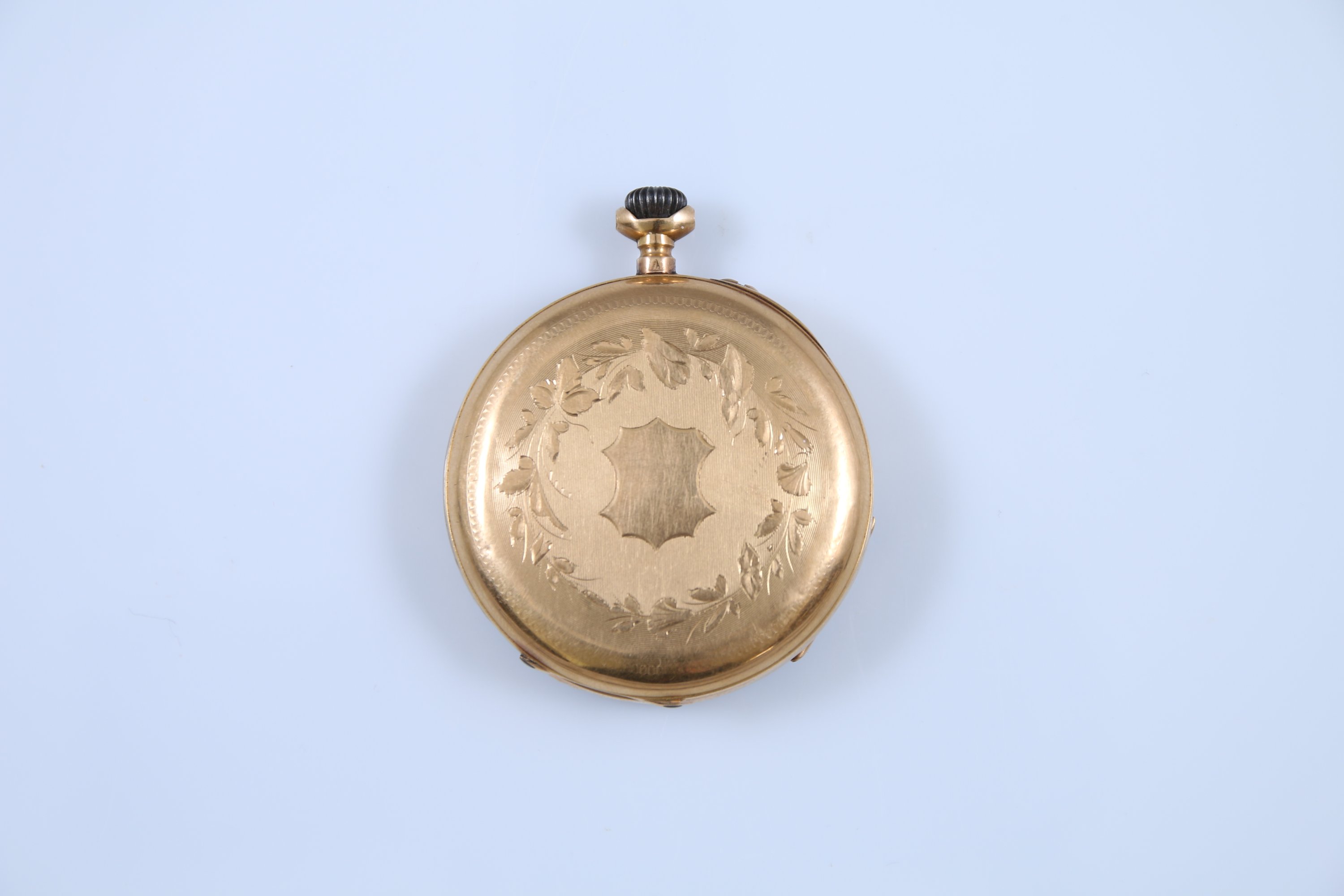 Le cadran émaillé blanc indiquant les heures par des chiffres romains, les minutes par des pointillets et chiffres arabes. Petite trotteuse à 6 heures. Le revers à décor d'un cuir. Cache poussière intérieur gravé échapp à cylindres 10 rubis".