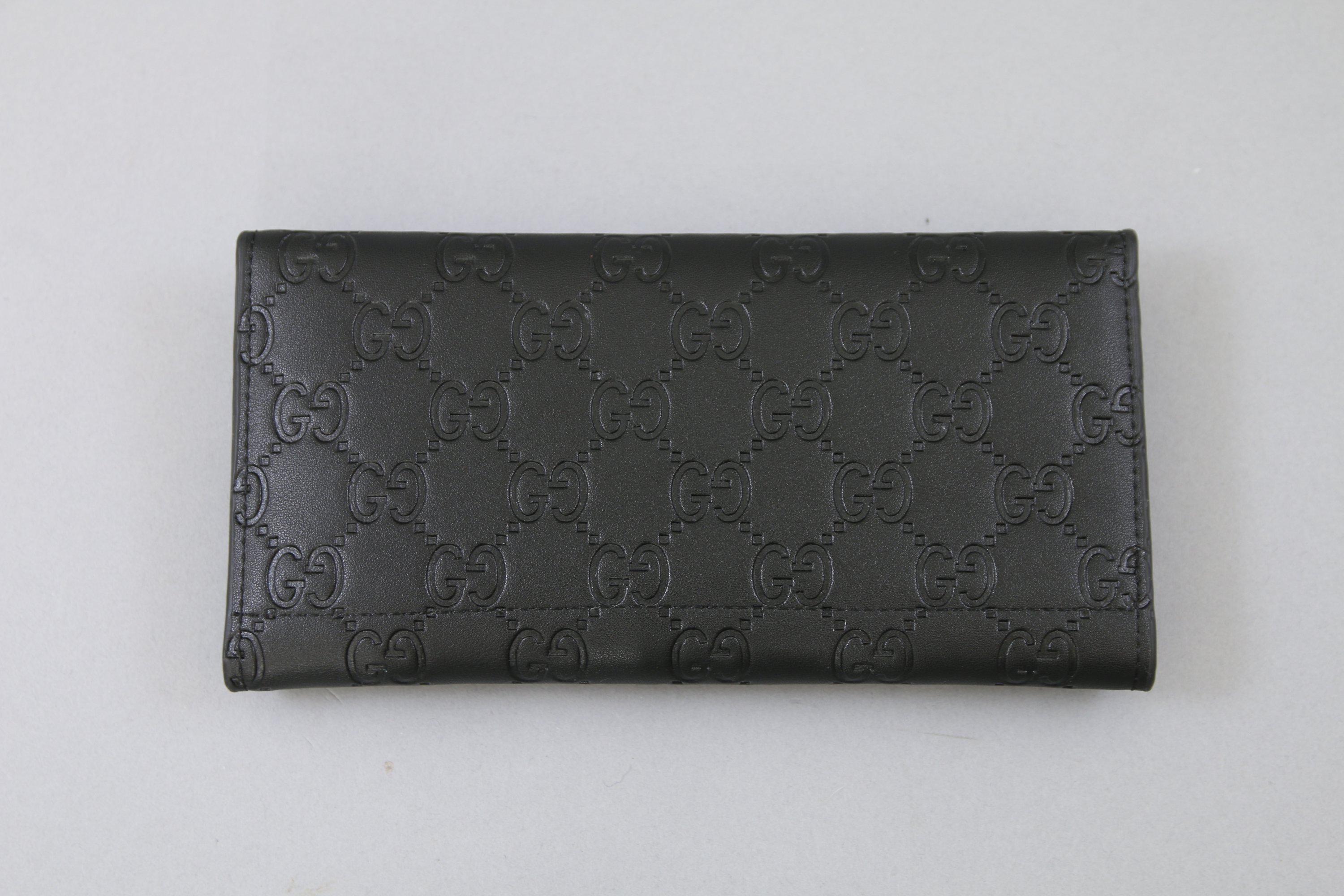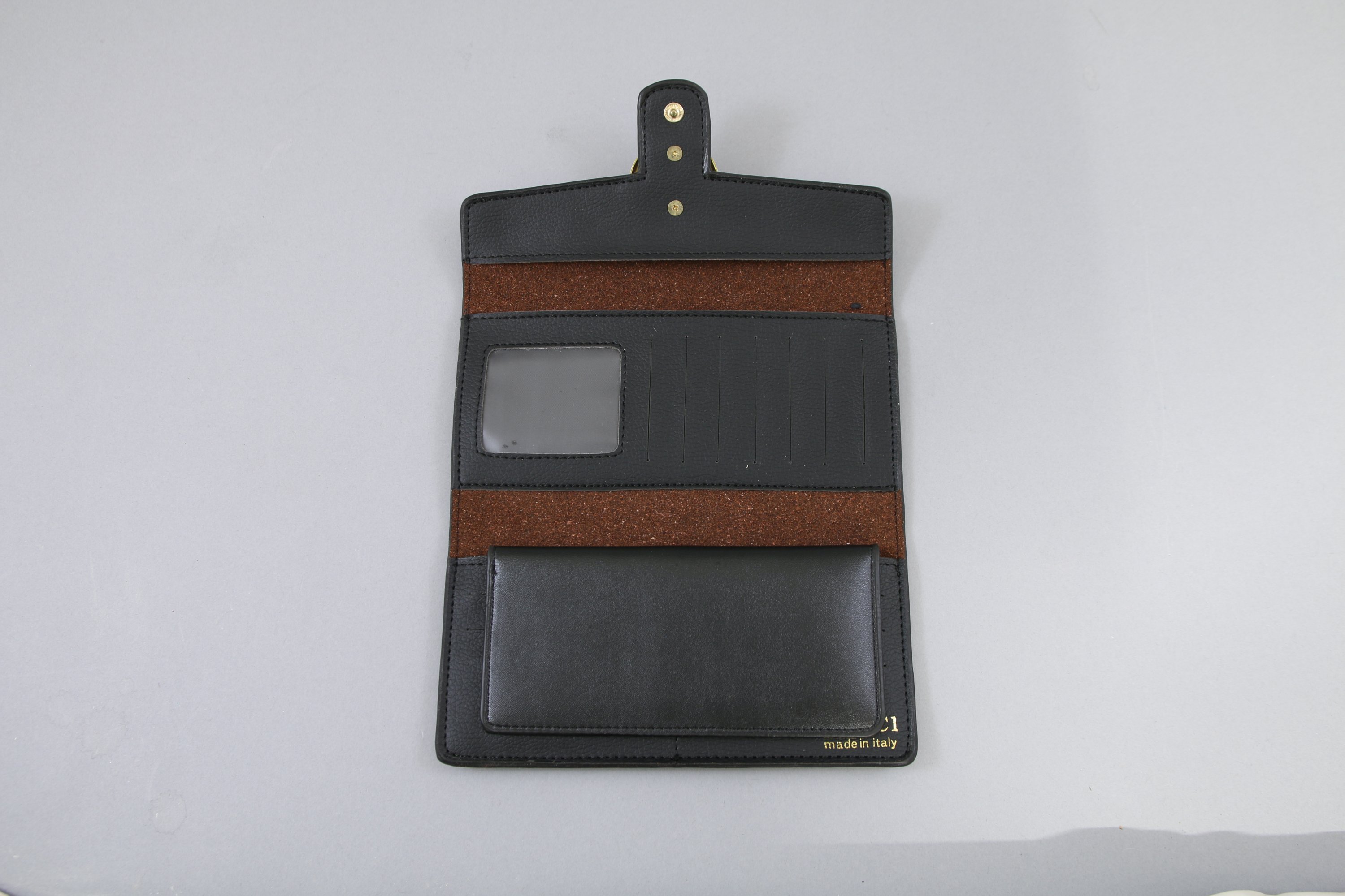 Cuir noir estampée au monogramme de la marque. Fermoir en métal doré.