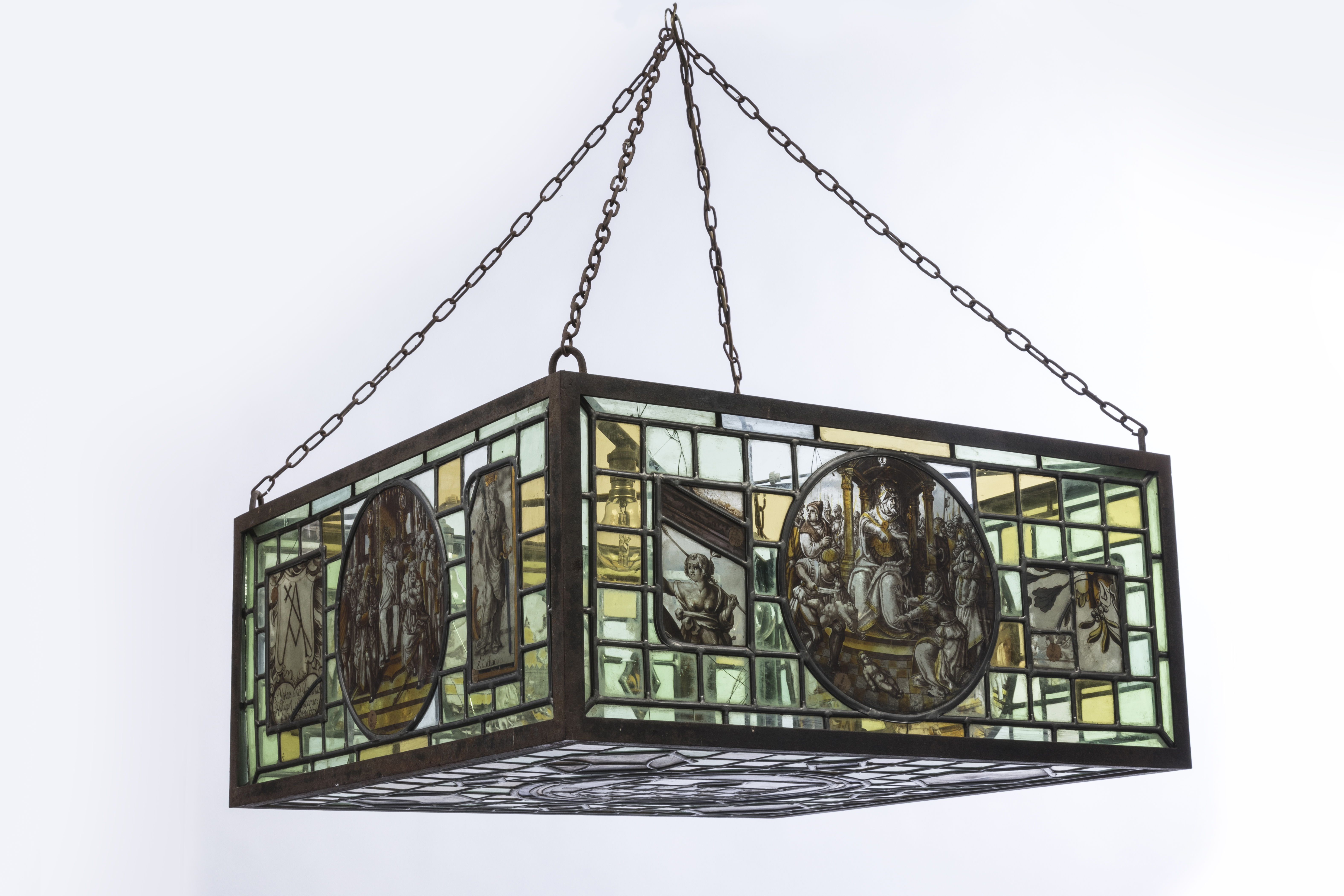 Ce lustre se démarque de ses semblables par le réemploi de fragments particulièrement abîmés de vitraux, ayant obligé le maître-verrier à découper les scènes ou à employer du plomb pour recoller le verre, dont le décor est dès lors moins lisible. Les faces latérales sont composées d’un décor chronologique issu de différents vitraux du XVIe siècle représentant la Déposition de Croix et la Mise au Tombeau.
