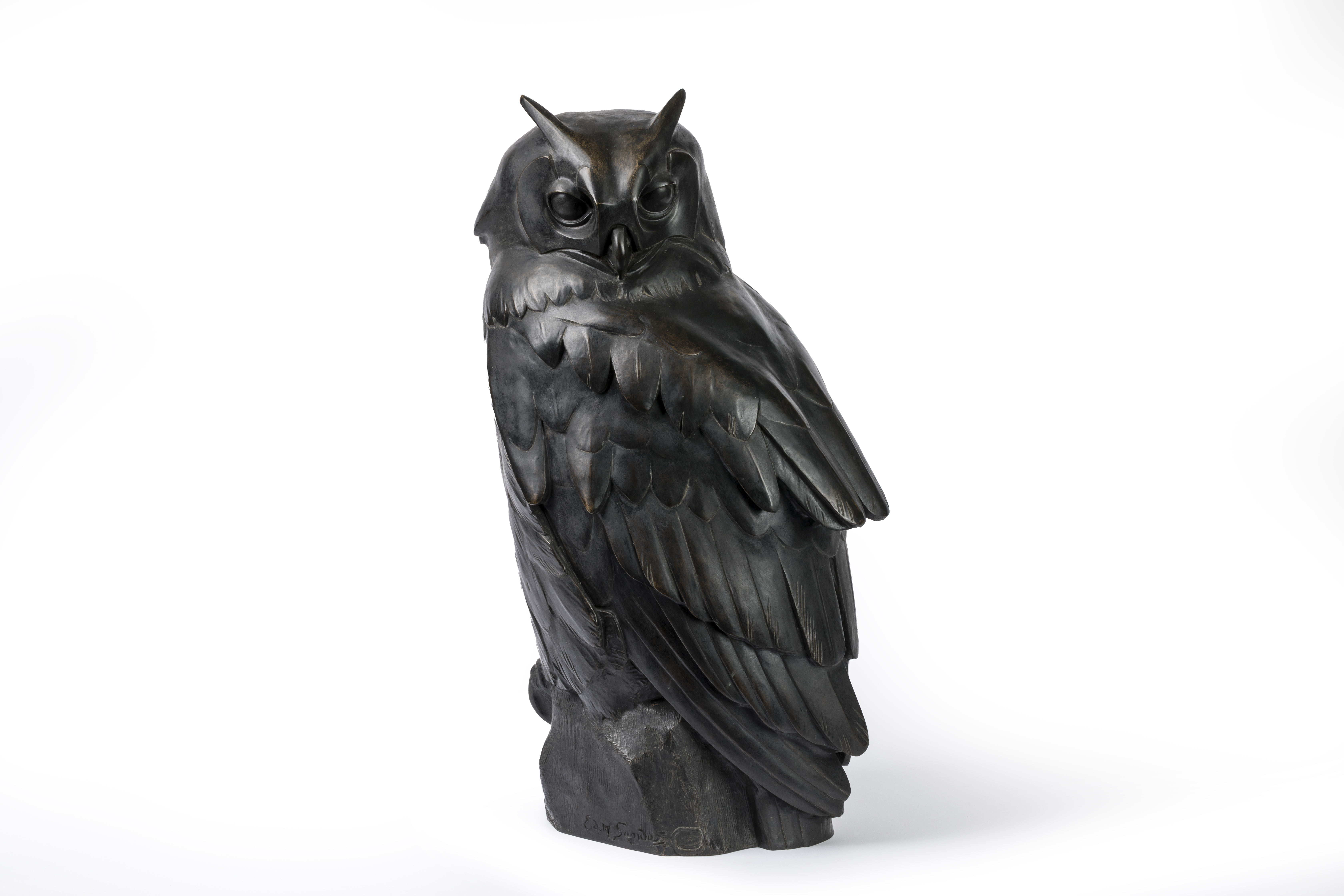 Le grand-duc est l’animal fétiche d’Edouard Marcel Sandoz, qui réalise son premier portrait d’animal en 1908, alors qu’il attrape un petit hibou lors d’un voyage en Sicile. Le rapace nocturne devient le sujet le plus représenté dans le corpus du sculpteur. Contrairement à d’autres artistes animaliers, hantant les zoos à la recherche de bêtes sauvages en captivité, Sandoz puise, lui, son répertoire dans l’observation d’animaux indigènes et pacifiques, dont il souligne la bizarrerie de la silhouette, la cocasserie de l’allure où, comme ici, la gravité de l’attitude.