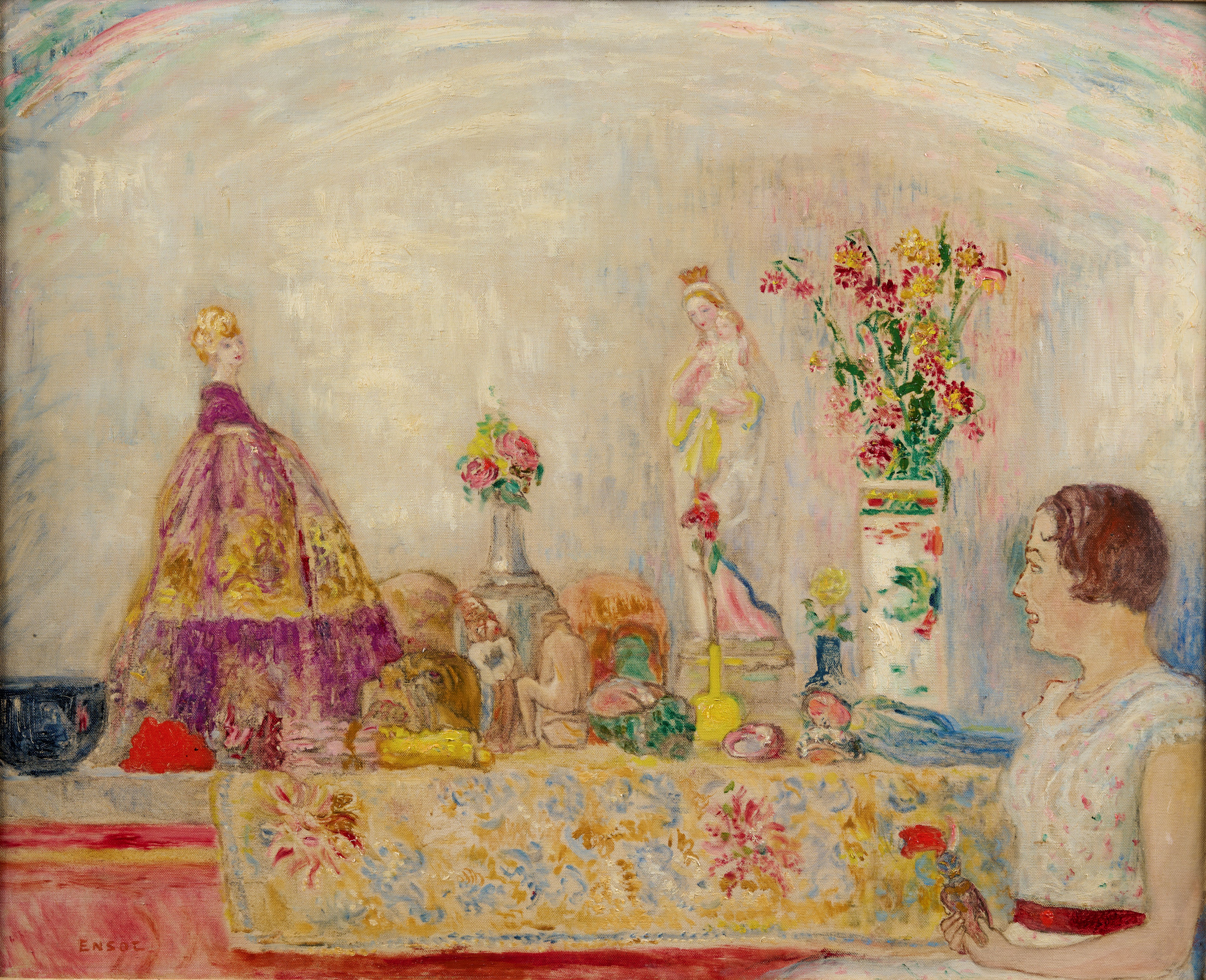 Tout ce qu’il aime est sur cette toile : des coquillages et des masques comme en vendaient sa chère mère. À droite d’une baigneuse en terre cuite trône la statue de Vierge à l’enfant qui régissait ses Squelettes à l’atelier (1900, Ottawa, Canada, National Gallery, inv. n°23976) et qui veillait pieusement sur le portrait de Ma mère morte (1915, Ostende, Belgique, Mu.ZEE, n°SM000713). Une poupée à gauche, la « mondaine », rappelle avec nostalgie au peintre de 73 ans l’époque de son Jardin d’amour (1888, Toyota, Japon, Musée des beaux-arts, inv. n°457) et son goût du travestissement. Une marionnette bleue, échouée au premier plan avec son visage effrayant, semble échappée de sa dénonciation des Infâmes vivisecteurs (1925, collection privée, T529). En pendant, à proximité d’un vaniteux crâne de squelette, le masque du théâtre japonais qui accompagnait six ans plus tôt le Portrait d’Alexandra Daveluy (1927, collection privée, T581) contemple la mondaine. Le tableau tout entier vibre de cette lumière légère que James Ensor affectionne désormais. Il qualifie les tons frais de cette toile de « cuisse de nymphe émue », de « rouge anglais » ou de « postérieur de macaque roséolé ». Une nappe colorée ornée de chrysanthèmes annonce le langage des fleurs, l’esprit de vagabondage et de cavalcade propre au carnaval qu’est la vie.