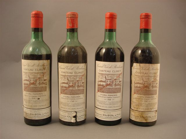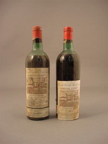 CHÂTEAU CLINET, Pomerol, 1940. 6 bouteilles (2 moyennement basses, 3 basses/très basses, 1 vidange). Étiquettes abîmées. 1 étiquette décollée.