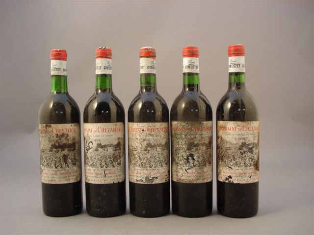 DOMAINE DE CHEVALIER. Pessac-Léognan, 1975 . 5 bouteilles (2 très légèrement basses). Étiquettes légèrement abîmées.