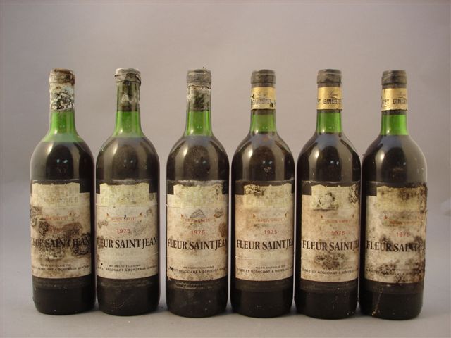 FLEUR SAINT-JEAN. Ginestet négociant à Bordeaux, 1975. 18 bouteilles (3 légèrement basses, 5 moyennement basses, 8 basses, et 2 basses / vidange). Capsules abîmées et étiquettes sales.