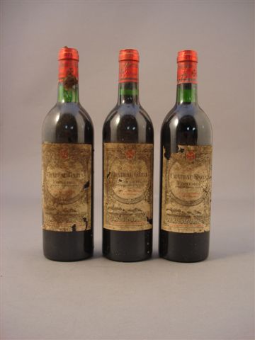 CHÂTEAU GAZIN. Pomerol, 1982. 3 bouteilles (1 légèrement basse, 1 moyennement basse). Étiquettes sales et abîmées.