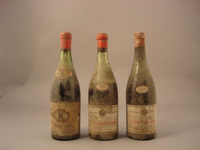 - 3 bouteilles de CLOS-VOUGEOT, Établissements Jean Lanternier Successeurs, 1943 (1 basse, 2 vidanges). Étiquettes sales.