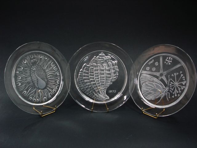 Trois ASSIETTES en cristal. Bassin à décor moulé et dépoli d'un papillon, d'un paon et d'un coquillage stylisés. Signées à la molette et datées respectivement 1969, 1970 et 1972.