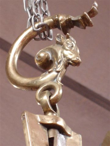 Crochet de suspension en volute feuillagée orné d'une tête de boeuf. Plateau concave en laiton et bronze retenu par 4 chaînes à éléments balustres. Poids mobile sphérique. Poinçons de contrôle.