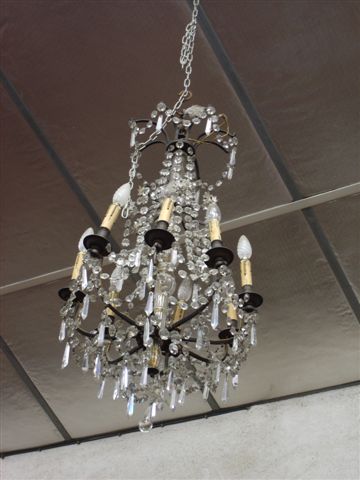 LUSTRE à 8 lumières, monture en bronze à guirlandes de pampilles et petits poignards en cristal. Amortissement en goutte.