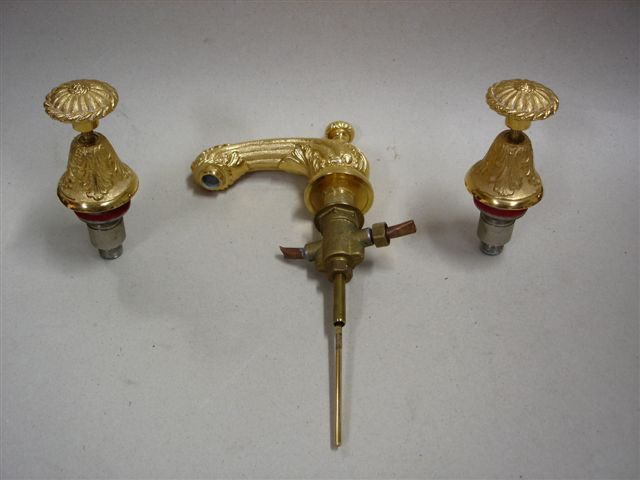 ROBINETERIE en métal doré comprenant robinet et deux boutons circulaires latéraux indépendants. Décor de godrons et feuilles d'acanthes.