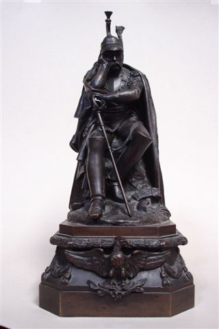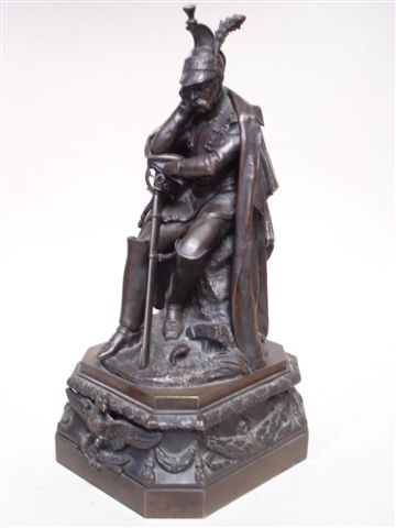 BRONZE à patine médaille représentant un militaire de l'Empire assis et accoudé sur son sabre. Base quadrangulaire à pans ornée de tores et guirlandes de lauriers, et d'un aigle sur sa face. Signé et titré sur la terrasse.