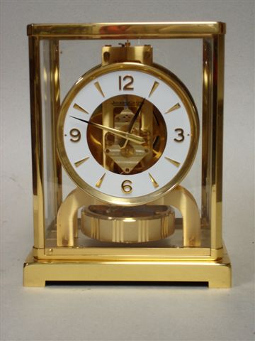 PENDULE ATMOS par JAEGER-LECOULTRE en bronze doré uni. Cage en parallélépipède droit, vitrée toute faces, reposant sur trois pieds dissimulés. Mouvement apparent. Balancier circulaire oscillant à décor de rayures verticales groupées par trois sur fond amati. Cadran circulaire à chiffres arabes dorés sur fond blanc.