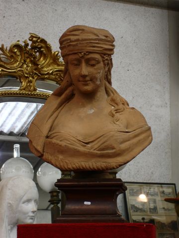 École EUROPÉENNE XIXème. BUSTE représentant une jeune femme, sultane? Terre cuite sur socle en bois naturel mouluré. Haut. 51 cm sans le socle, Larg. 41cm. Socle: Haut. 14, Larg. 21, Prof. 21cm. XIXème. (accidents et manques)