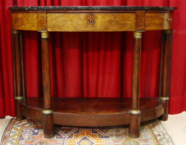 CONSOLE DEMI-LUNE en acajou et placage d'acajou ouvrant à trois tiroirs en ceinture. Elle présente quatre colonnes dont deux détachées, baguées de bronzes aux pampres de vigne. Tablette d'entrejambe et dessus de marbre granité.