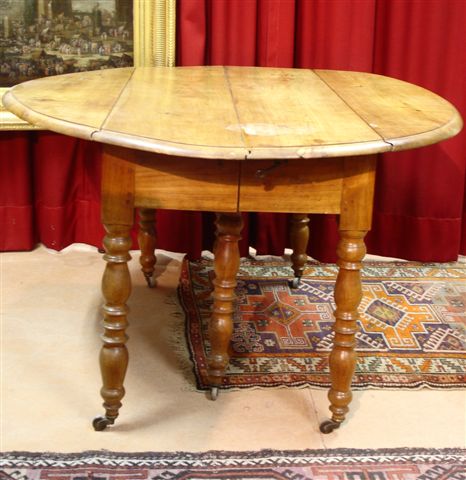TABLE ovale à allonges médianes, à abattants, en cerisier reposant sur six pieds tournés à double balustre. Roulettes.