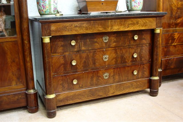 COMMODE en placage d'acajou ouvrant à quatre tiroirs. Colonnes détachées baguées de bronze à décor estampé de pampres de vigne. Dessus de marbre granité.