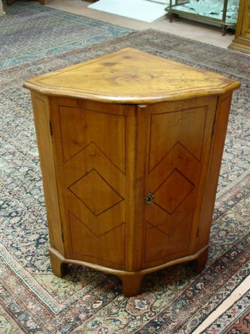 ENCOIGNURE en bois fruitier ouvrant à deux vantaux galbés incrustés de filets géométrisés et chevrons. Dessus à croix de Malte, entourage de filets de bois sombre. Porte - une estampille: J.B. GALET et poinçon de maîtrise: JME.