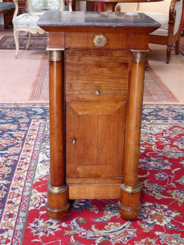 CHEVET en acajou et placage d'acajou ouvrant à un tiroir et un vantail, à colonnes détachées baguées de bronze. Dessus de marbre noir veiné (petits éclats).