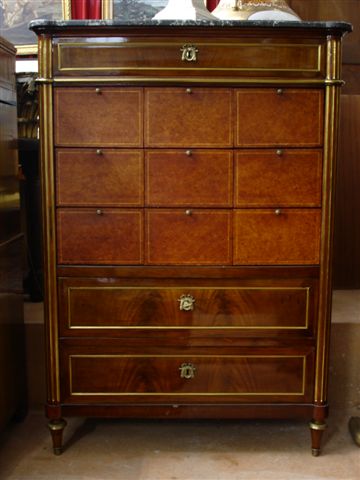 SECRÉTAIRE transformé en CHIFFONNIER-CARTONNIER en placage d'acajou ouvrant à trois tiroirs et neuf cartons. Ornementation de laiton: cannelures sur les montants, baguettes sur les tiroirs. Pieds toupies bagués.