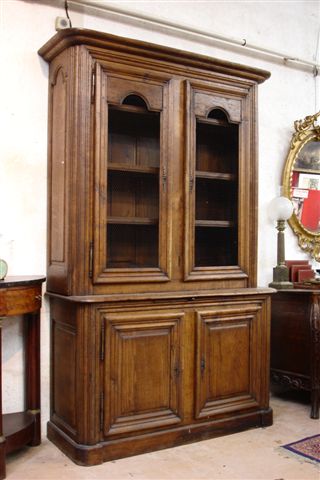 BUFFET DEUX-CORPS sur plinthe en chêne mouluré ouvrant à quatre vantaux, les deux vantaux supérieur grillagés. Corps supérieur en léger retrait aux cotés moulurés. Tirette centrale.