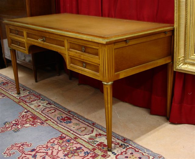 BUREAU droit en bois teinté ouvrant à quatre tiroirs en ceinture. Pieds fuselés et cannelés. Ornementation de bronzes: sabots, entrées de serrure, bagues et baguette en doucine sur le plateau. Cuir fauve doré aux fers.