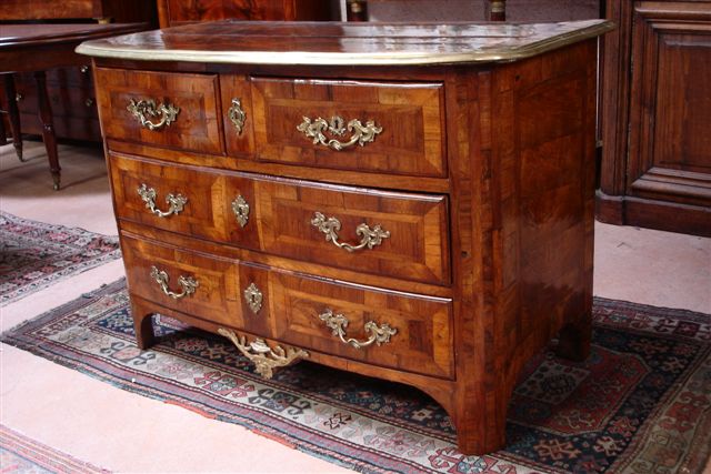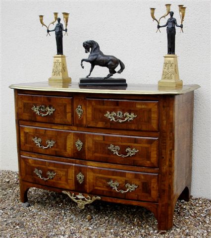 COMMODE en bois de placage à façade galbée ouvrant à quatre tiroirs sur trois rangs. Décor marqueté d'encadrements. Dessus plaqué en ailes de papillon dans des motifs géométriques entrelacés - plateau ceint d'une lingotière de bronze. Montants arrondis.