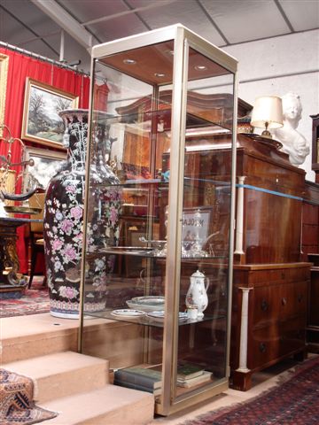 VITRINE en verre à stucture en métal, sur roulettes, moderne. Quatre étagères en verre.