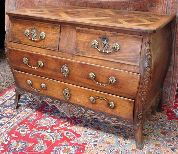 COMMODE galbée toutes faces en bois naturel en ouvrant à 4 tiroirs sur 3 rangs. Traverses inférieures sculptées de coquilles et de fleurs stylisées. Dessus de bois parqueté. Ornementation de bronze: poignées de tirage et entrées de serrure.