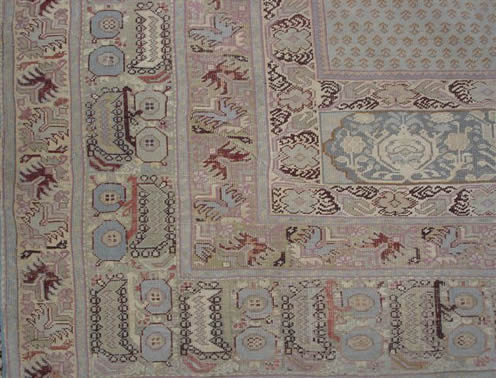 TAPIS d'Orient, YORDES, ancien, à motif de mirhab sur fond moucheté. Bordure représentant des pommes et des peignes.