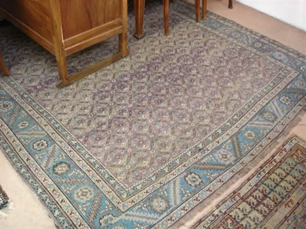 TAPIS d'Orient, BAKCHEICH, nord ouest de la Perse, à fond compartimenté à dominante brune. Bordure bleu azur à décor floral. Vers 1870. 295 x 220 cm (dans l'état).