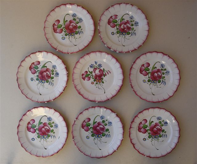 EST - Suite de 8 ASSIETTES en faïence de petit feu. Décor polychrome de fleurs. Aile à bordure festonnée.